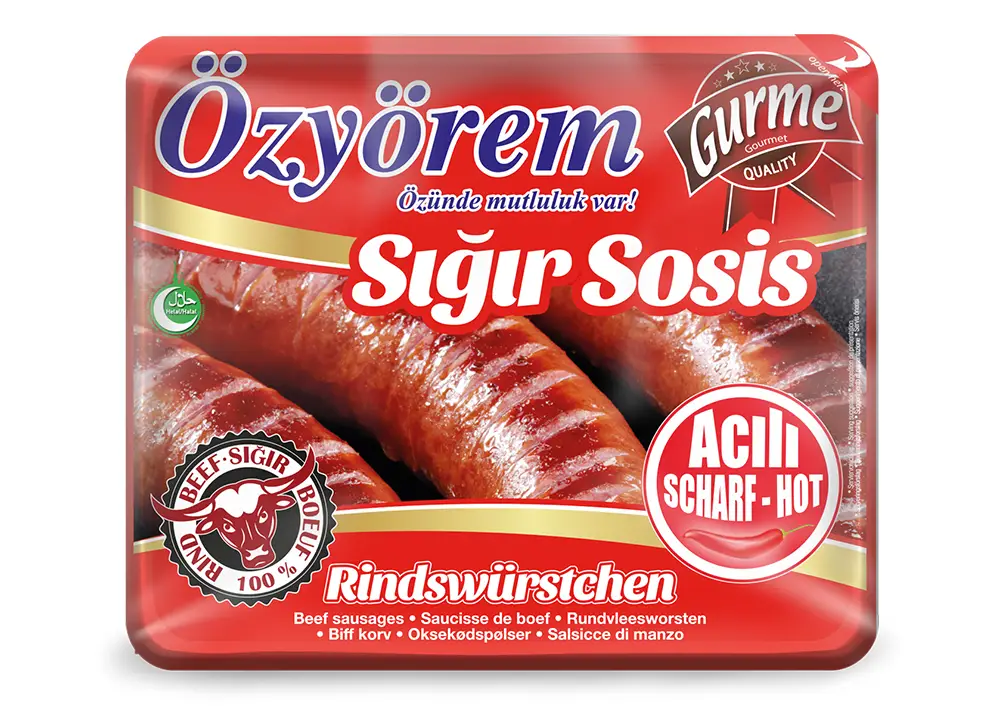 Özyörem Sığır Sosis Acılı sind würzige Rindswürstchen mit feuriger Note, hergestellt aus 100 % bestem Rindfleisch. Dank ausgewählter Gewürze und Chili bieten diese Halal-zertifizierten Würstchen einen intensiven, pikanten Geschmack, der Liebhaber scharfer Speisen begeistert.800g