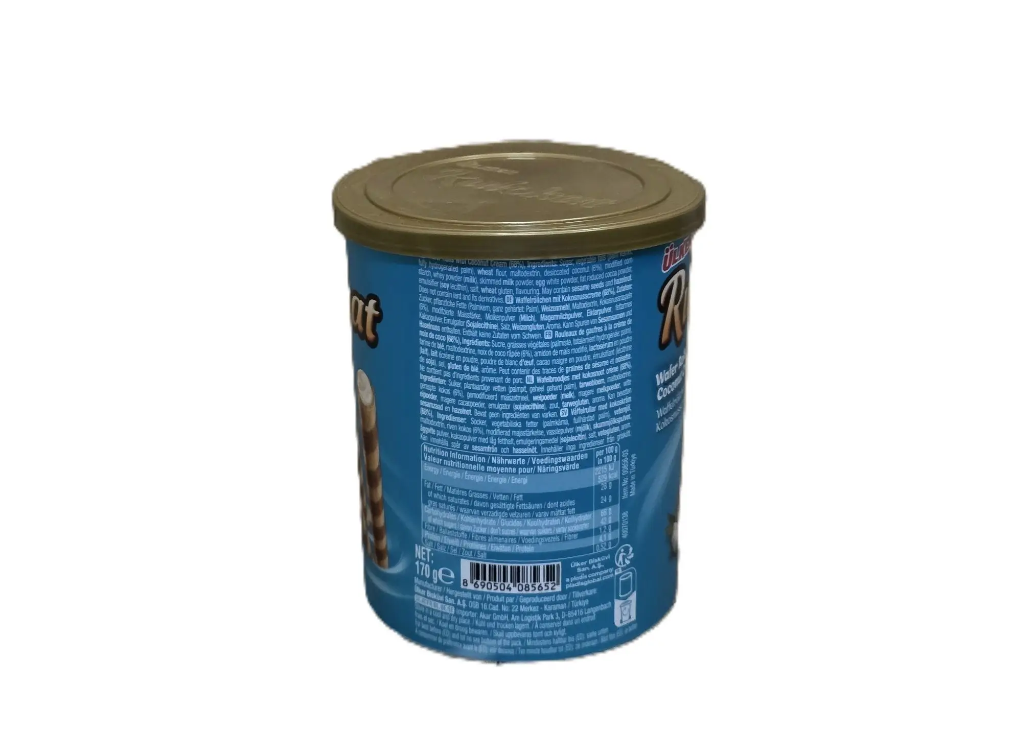 Knusprige Waffelröllchen gefüllt mit Kokosnusscreme, 170g Packung.