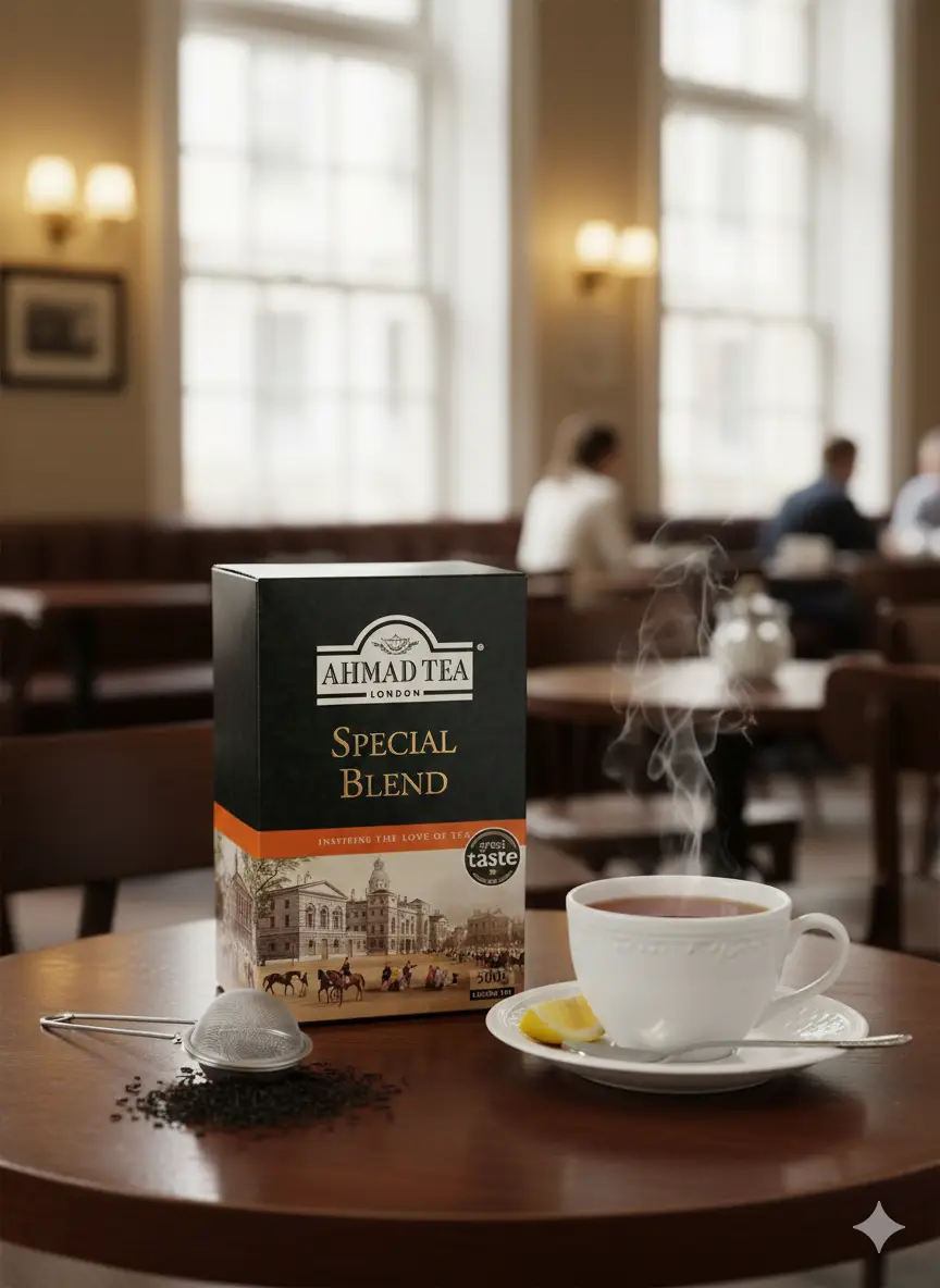 Ahmad Tea Special Blend 500g ist eine edle Mischung feinster Tees aus Sri Lanka und anderen Regionen, verfeinert mit Bergamotte-Aroma. Er bietet eine goldene Farbe, eleganten Duft und einen milden Geschmack. Am besten pur zu genießen.