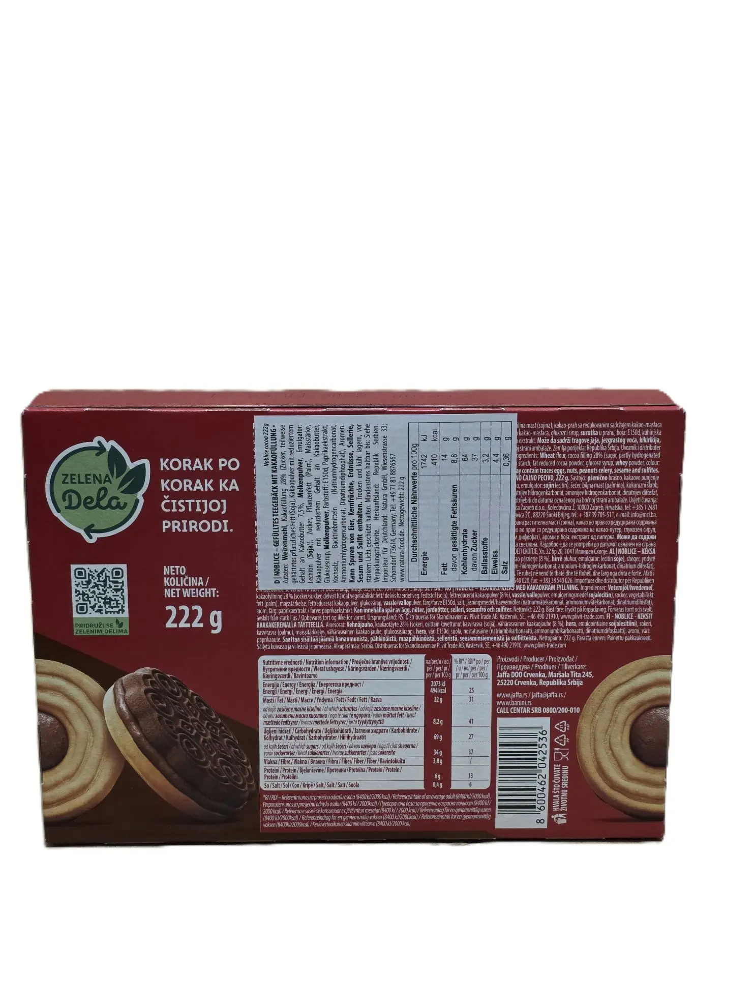 Classic sandwich biscuits with a smooth cocoa filling. Contains 4 individual packs per box. Net weight: 222g.