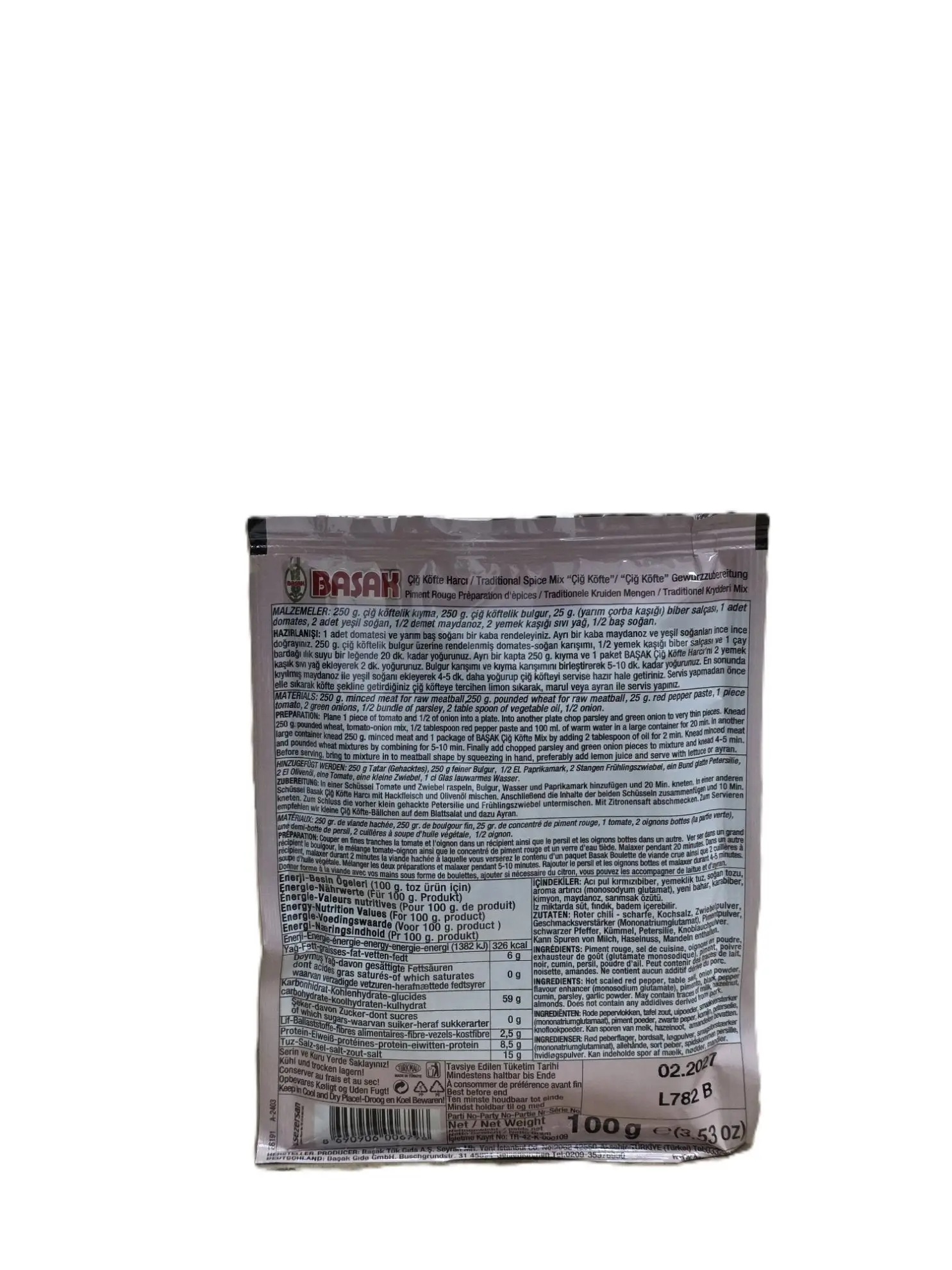 Basak Ciğ Köfte Gewürzmischung – Traditionelle türkische Gewürzmischung für hausgemachte Ciğ Köfte. Aromatisch und würzig. Nettogewicht: 100g. Kategorie: Lebensmittel.