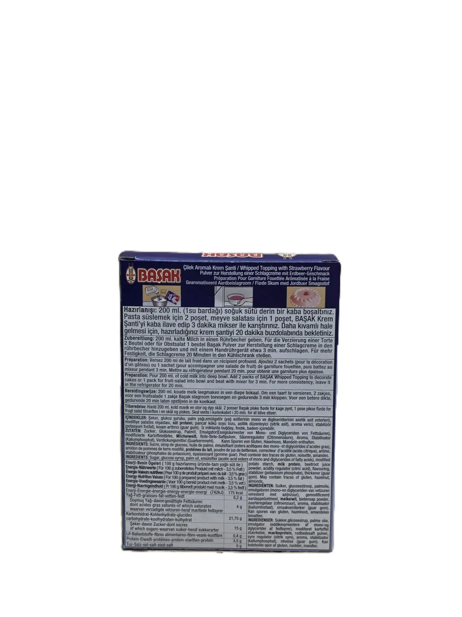 Basak Schlagsahne mit Erdbeergeschmack – Pulver zur Herstellung einer cremigen und fruchtigen Schlagsahne. Perfekt für Kuchen, Desserts und Obstsalate. Nettogewicht: 150g. Kategorie: Backzutaten & Desserts.