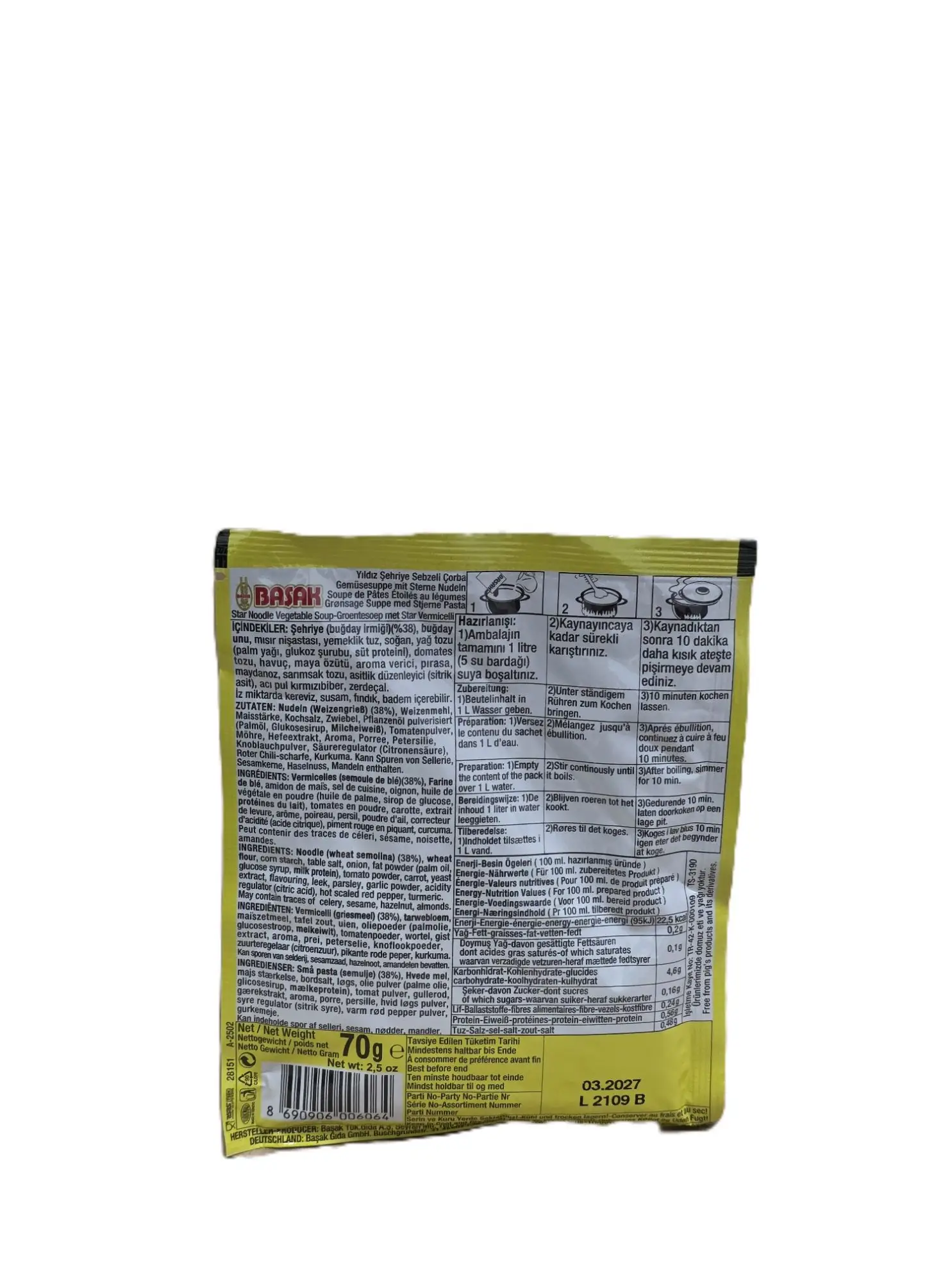 Basak Gemüsesuppe mit Sternnudeln – Leichte und schmackhafte Suppe mit Sternnudeln und Gemüsearomen. Nettogewicht: 70g. Kategorie: Lebensmittel.
