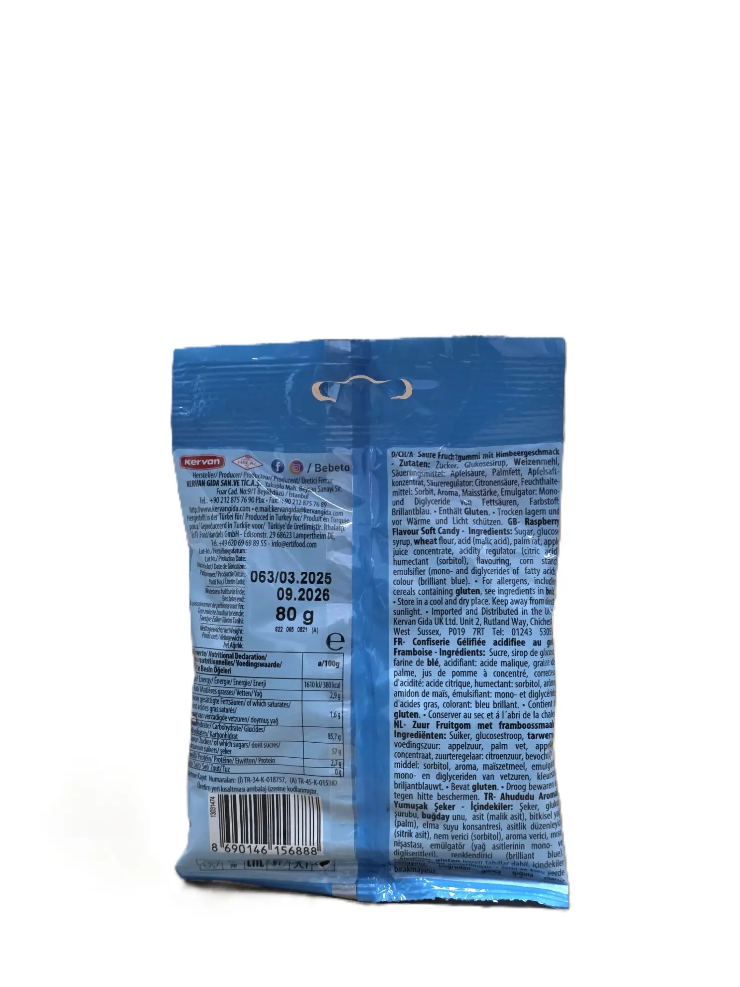 Extra lange Fruchtgummi-Schnüre mit saurem Blaubeer-Himbeer-Aroma. Vegan.