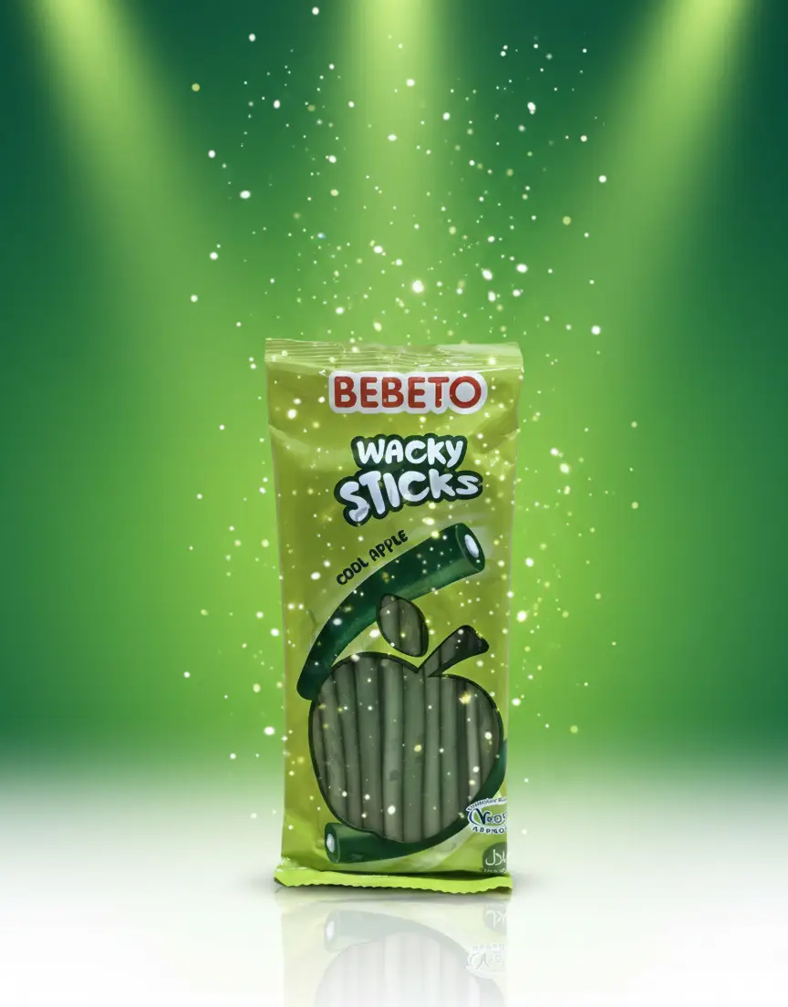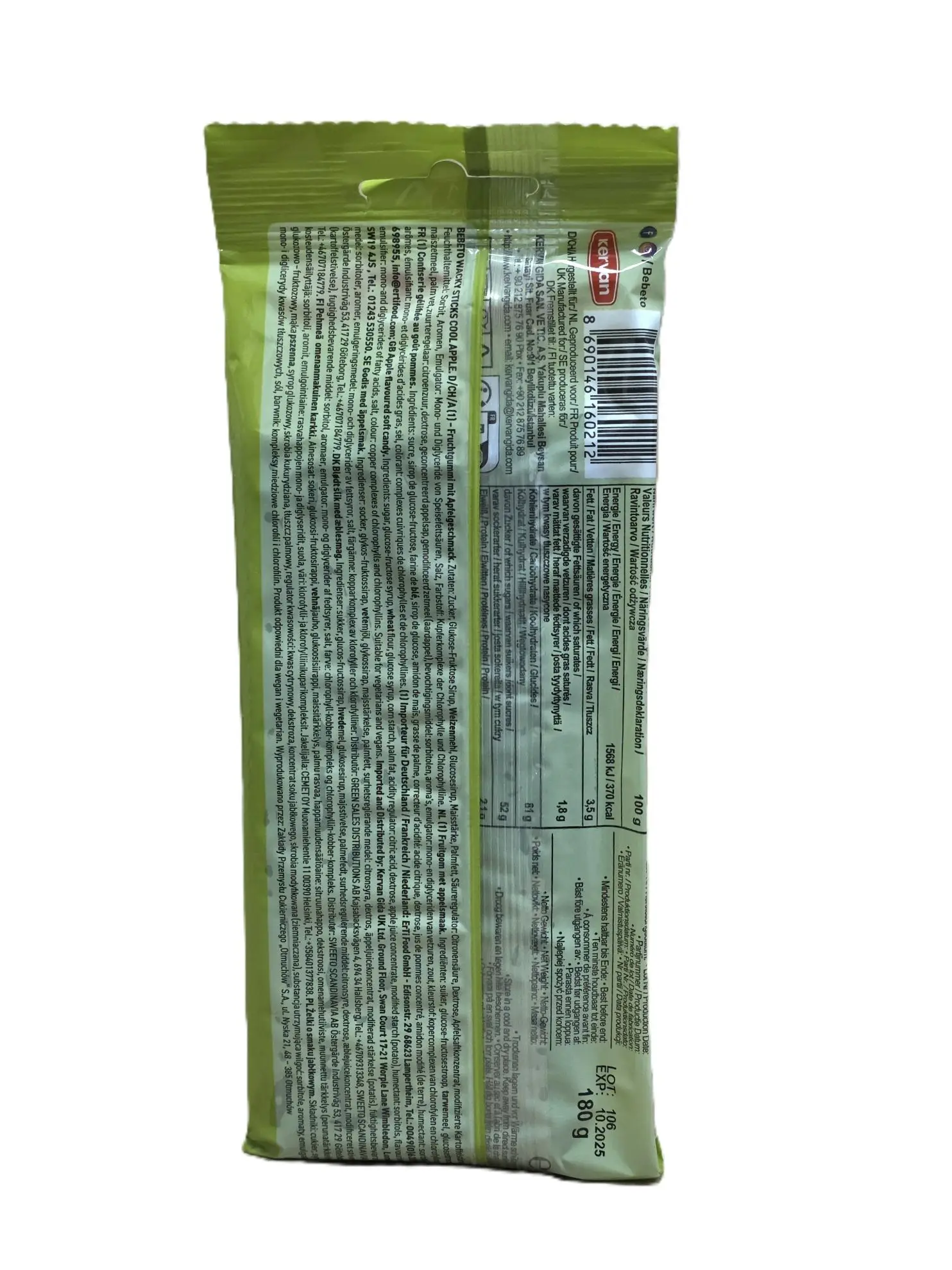 Softe Fruchtgummistangen mit erfrischendem Apfelgeschmack und einer hellen Konfektfüllung. Vegan und Halal-zertifiziert.