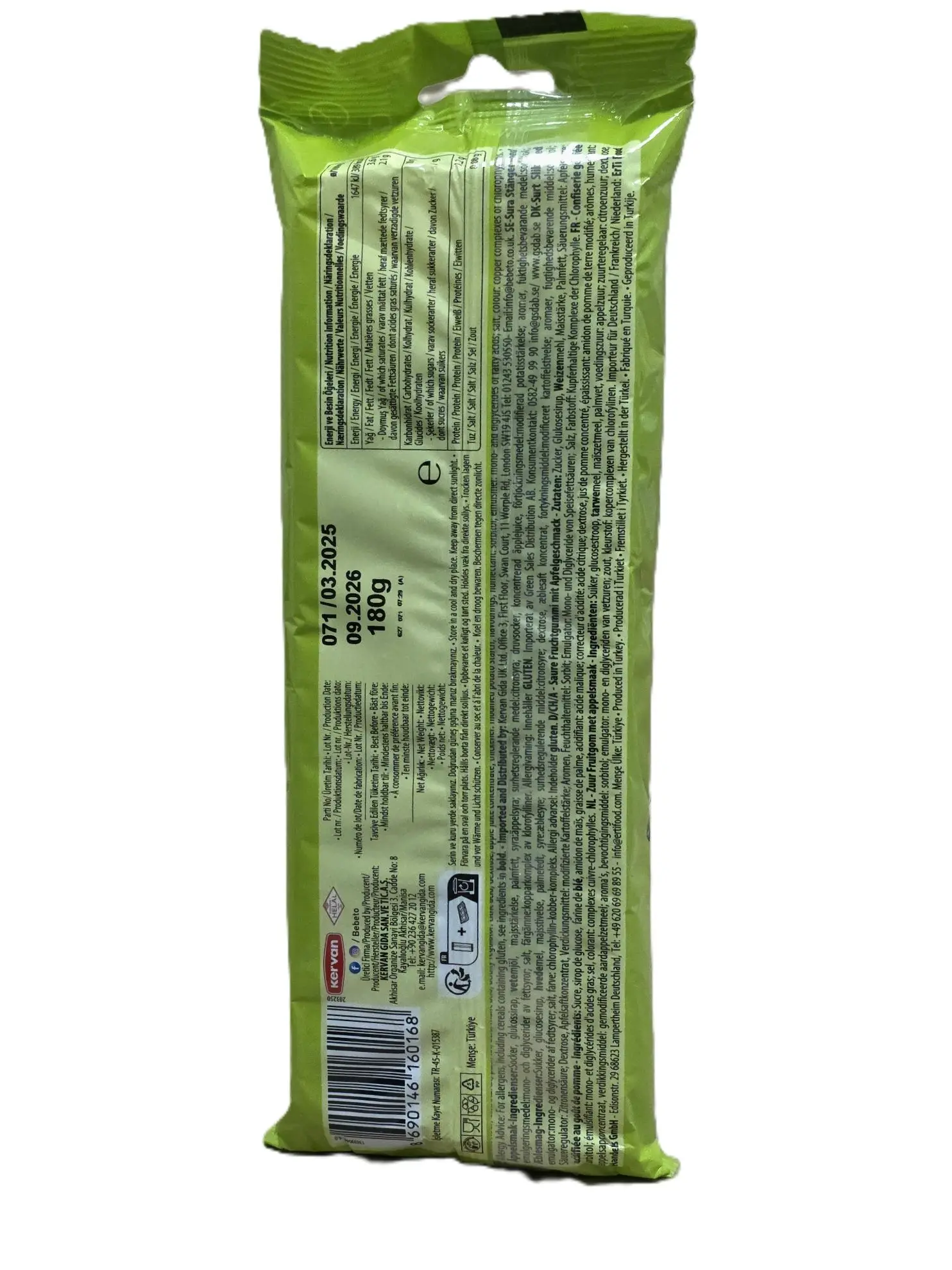 Saure Fruchtgummistangen mit intensivem Apfelgeschmack und prickelnder Zuckerhülle. Vegan und Halal-zertifiziert.