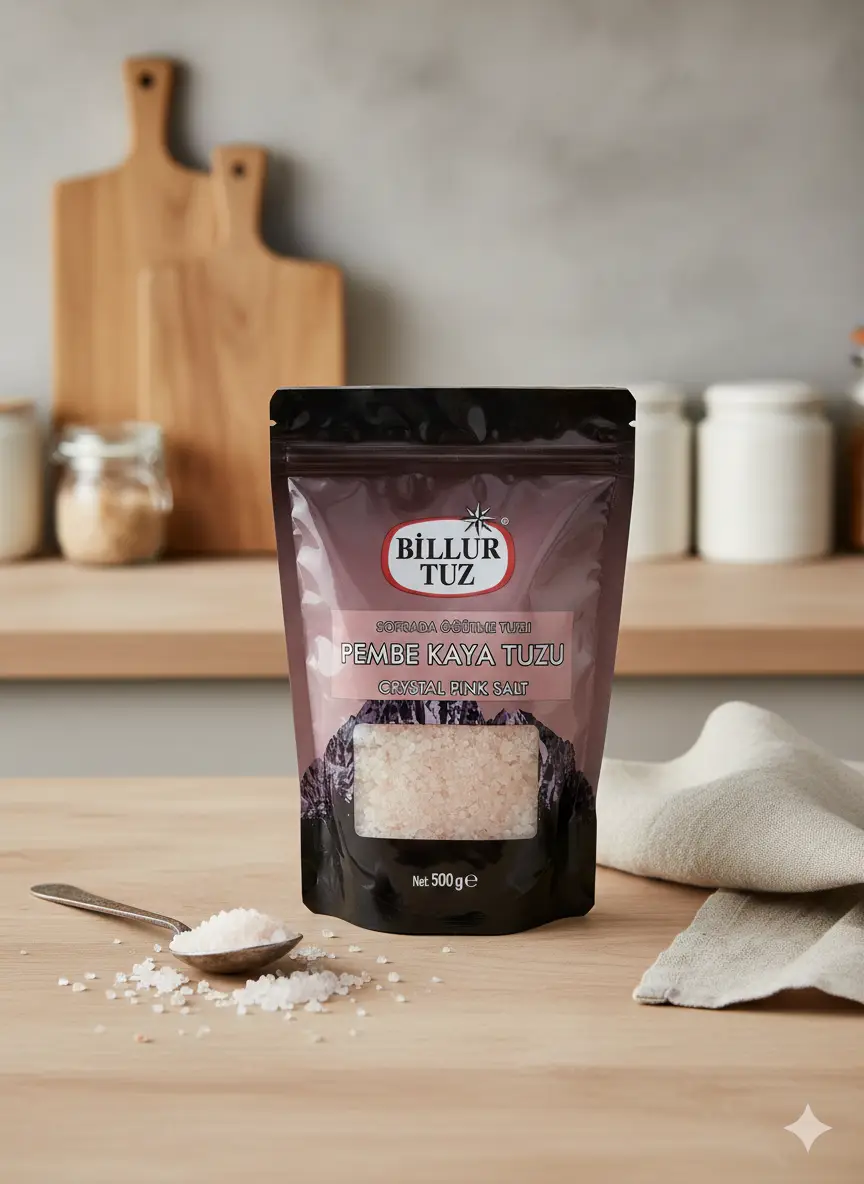 Billur Crystal Pink Salt – Rosa Kristallsalz in Beutelverpackung, perfekt für Salzstreuer und Mühlen. Inhalt: 500g.