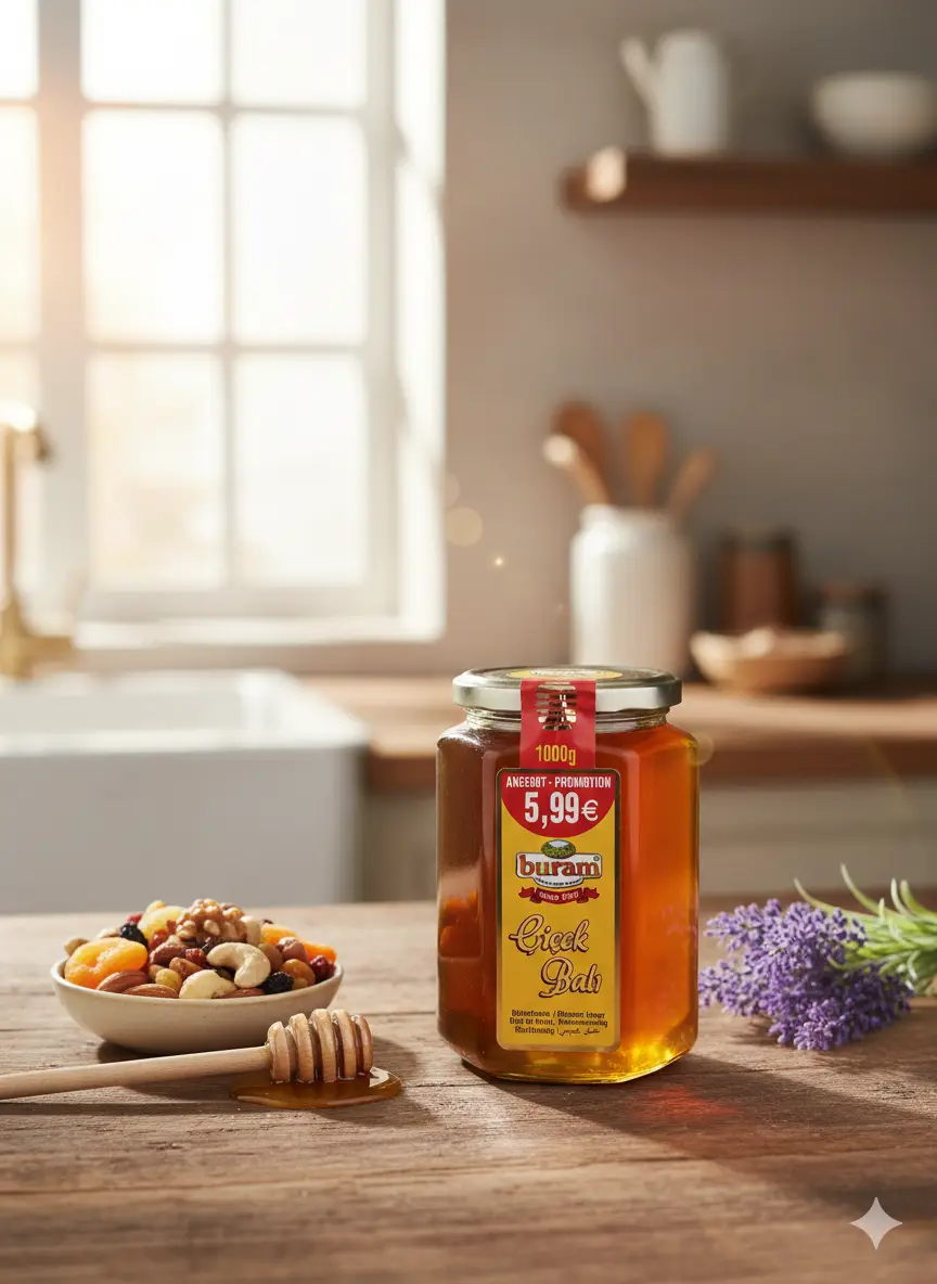 Buramcicek Honig 1000g – Natürlicher Blütenhonig, reich an Aroma und Nährstoffen. Dieser Honig wird aus den Nektarquellen verschiedener Blumen gewonnen und eignet sich ideal zum Süßen von Tee, Joghurt oder Backwaren.