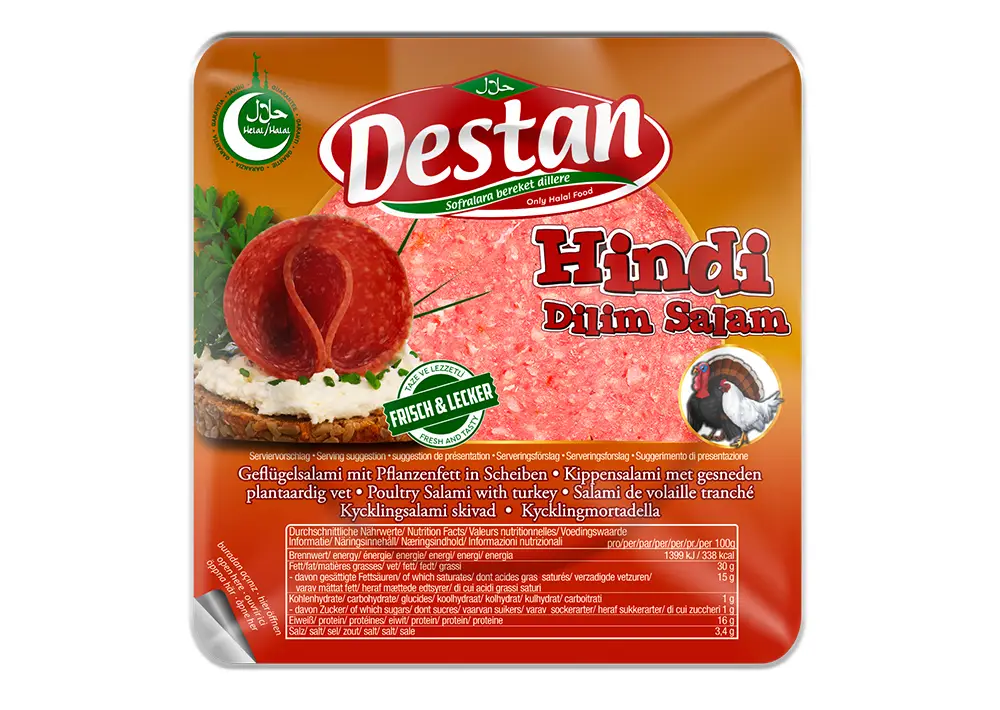 Geräucherte Geflügelsalami mit Pflanzenfett, in feinen Scheiben. Mild im Geschmack und ideal für Sandwiches, Schulbrote oder als Snack. Halal-zertifiziert. 150g-Packung.
