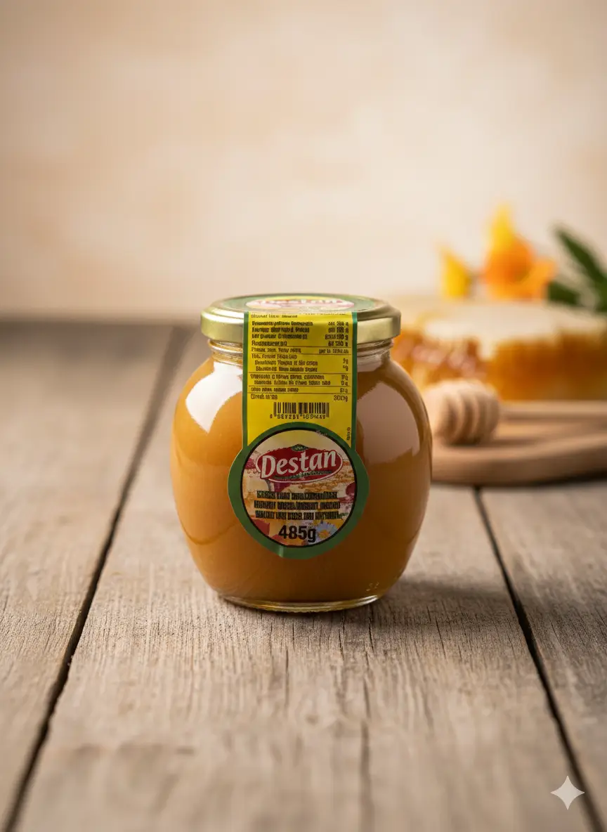 Destan Sirup mit Wabenstück 485g – Einzigartiger Sirup mit echtem Honigwabenstück. Eine besondere Delikatesse für Honigliebhaber.