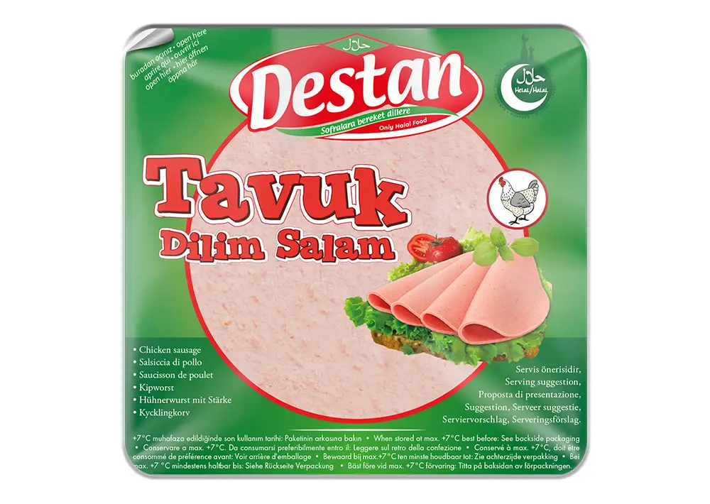 Destan Tavuk Salam in Scheiben ist ein milder Hähnchenaufschnitt mit feiner Würzung. Ideal für Sandwiches oder Frühstück. Halal-zertifiziert, proteinreich, praktisch in der 200g-Packung.