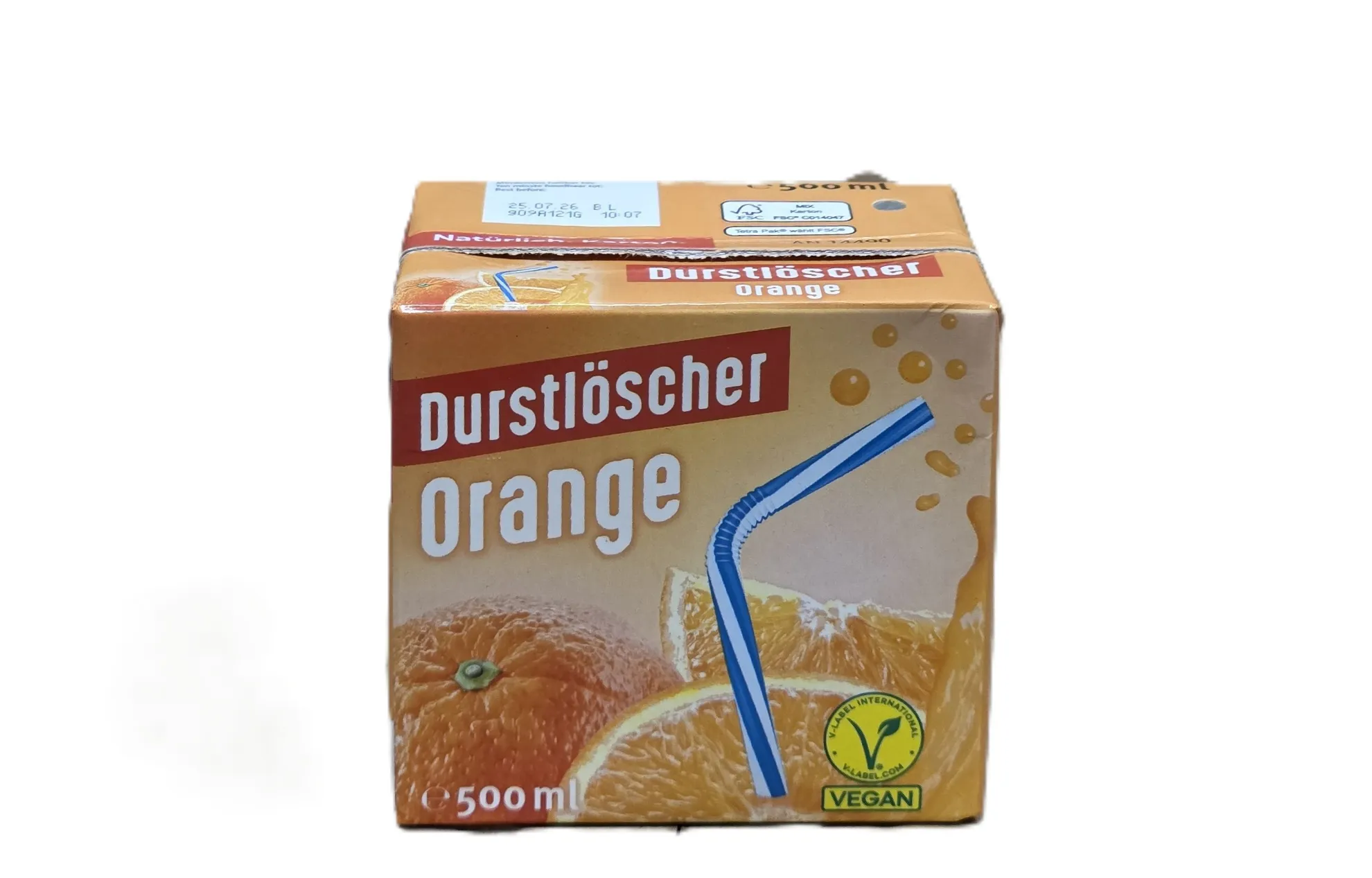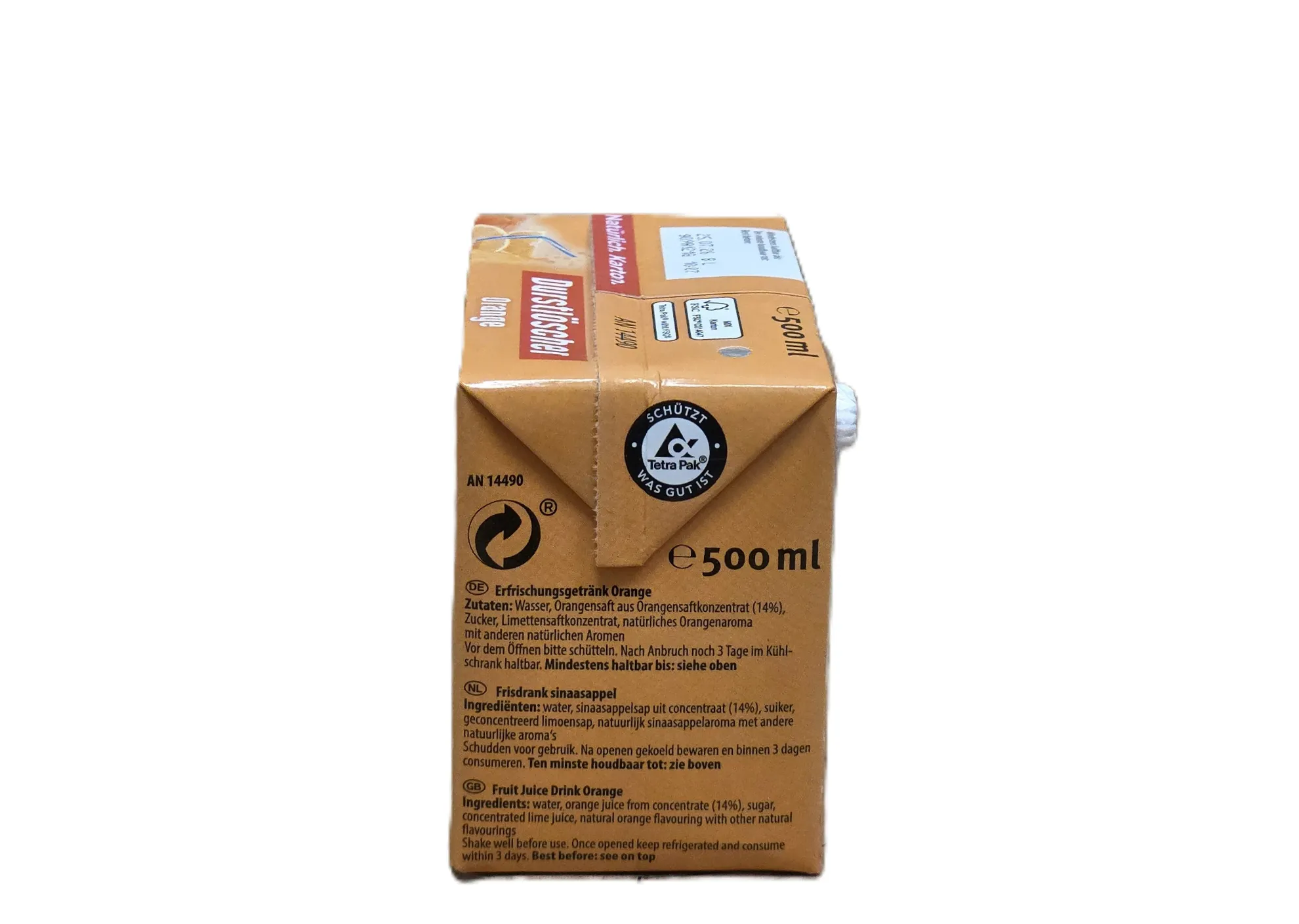 Erfrischungsgetränk mit Orangengeschmack aus Orangensaftkonzentrat (14%). Vegan. In der 500ml Packung.