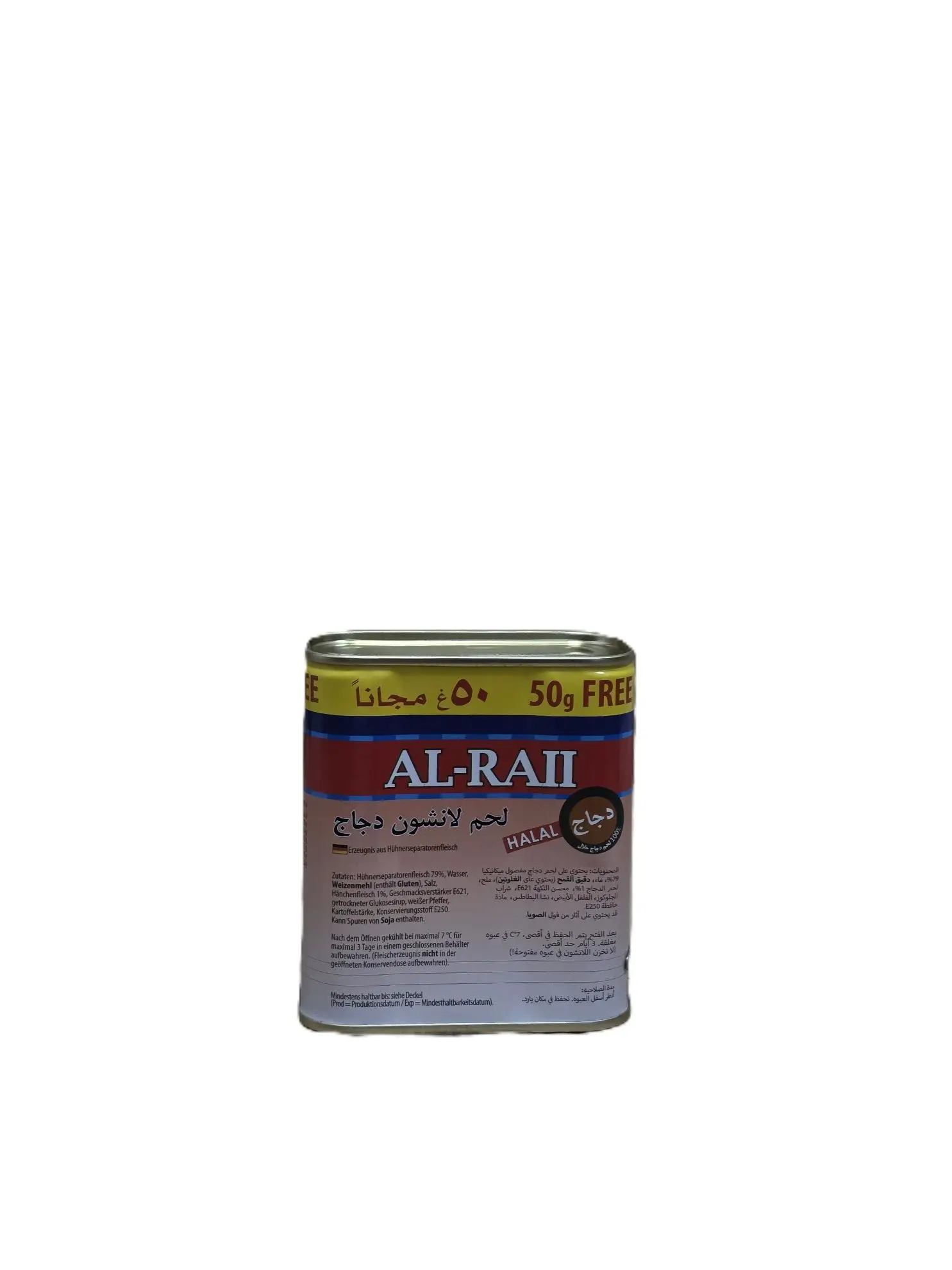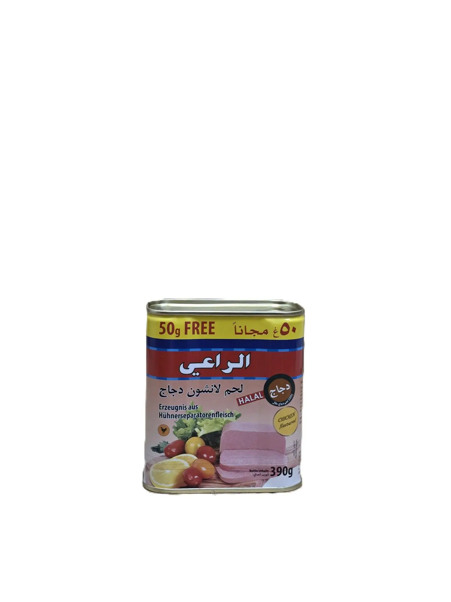 El-Raii Hühnerfleisch 390g – Halal Luncheon Meat, hergestellt aus Hühnerseparatorenfleisch. Praktisch und vielseitig für Sandwiches, Snacks und warme Gerichte. Nettogewicht: 390g.