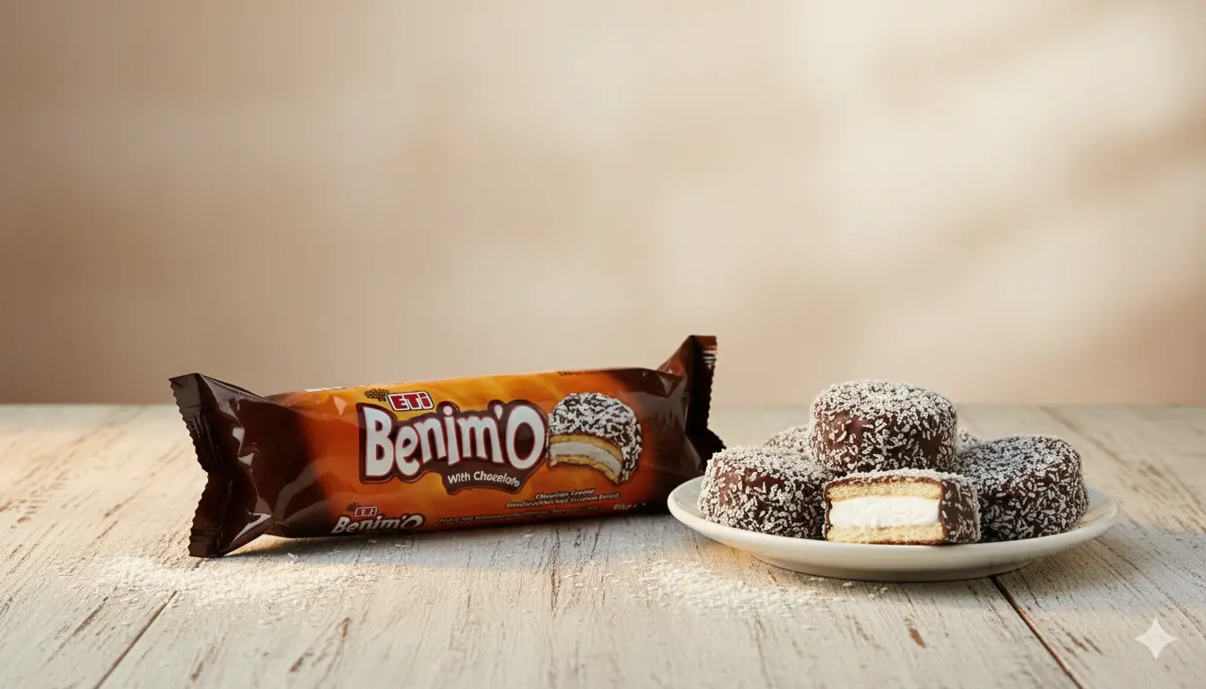 Eti Benim’O – Schaumzuckerbiskuit mit Schokoladenüberzug, bestreut mit Kokosraspeln. Nettogewicht: 80g. Kategorie: Snacks.