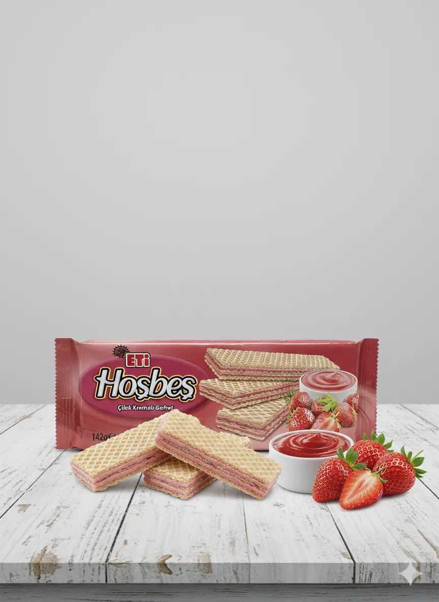 Eti Hoşbeş Erdbeere – Knusprige Waffeln mit cremiger Erdbeerfüllung. Perfekt für süße Momente. Nettogewicht: 142g. Kategorie: Snacks.