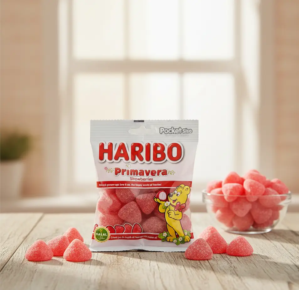 Weiche, zuckerbeschichtete Fruchtgummis mit Erdbeergeschmack. Halal-zertifiziert.