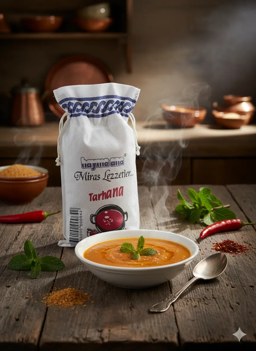 Traditionelle, handgemachte Tarhana Suppe (Tarhana), in einem Naturprodukt-Stoffbeutel verpackt.