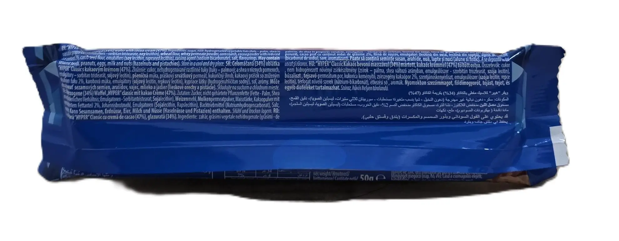 Hyper Classic Waffel mit Schokoladen- und Kakaocremefüllung, überzogen mit Schokolade, 50g Riegel.