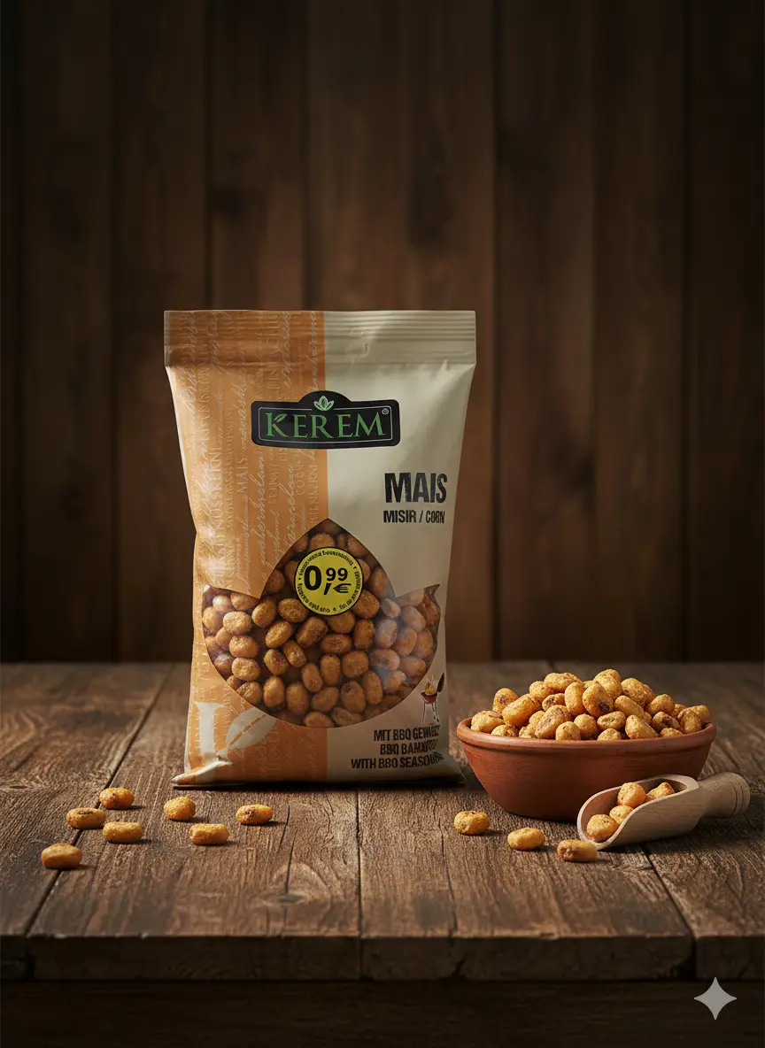 Kerem Mais mit BBQ-Gewürz – knusprig gerösteter Mais mit würziger BBQ-Note. Perfekt zum Knabbern. Inhalt: 150g.