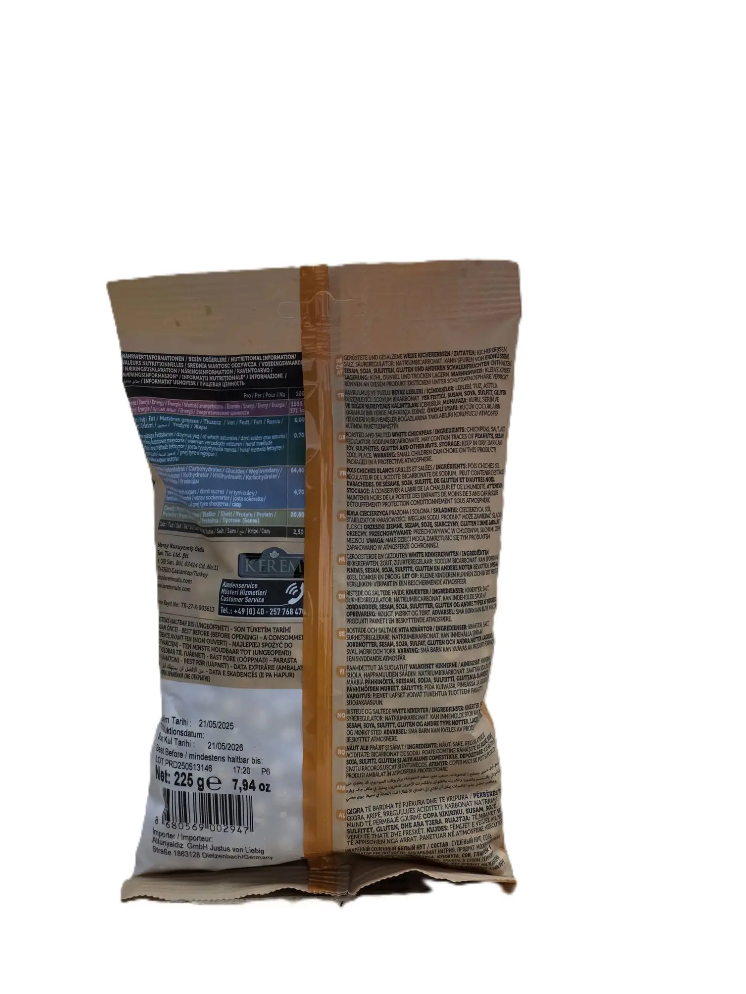 Kerem Weisse Kichererbsen – gesalzene, knusprig geröstete weiße Kichererbsen. Ideal zum Snacken. Inhalt: 225g.
