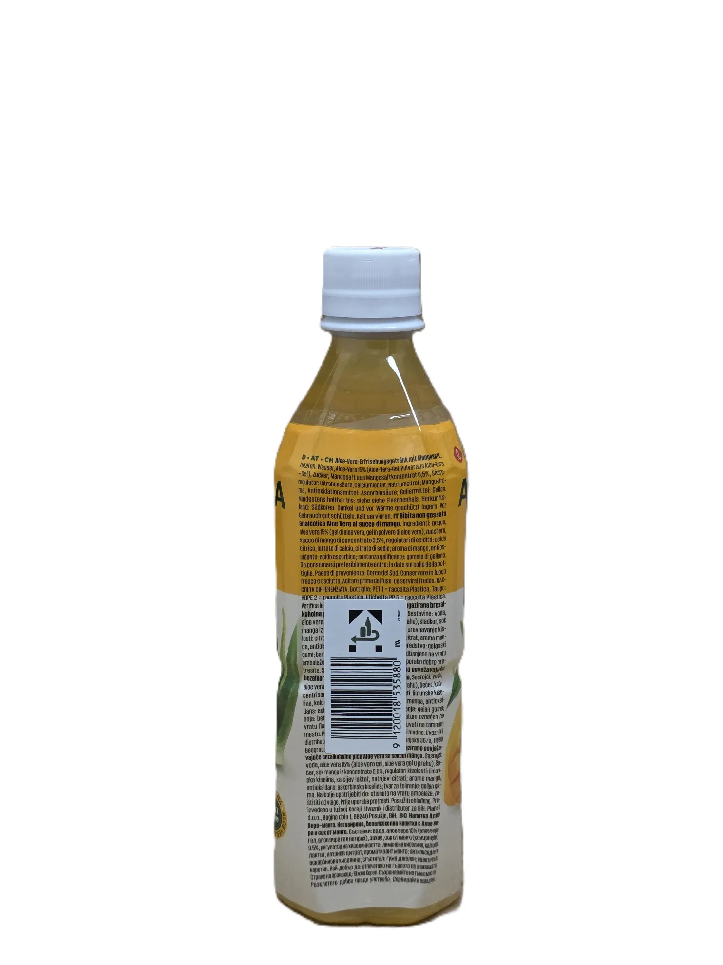 Exotisches Erfrischungsgetränk mit Aloe Vera Stücken und natürlichem Mango-Geschmack. 0,5L Flasche.