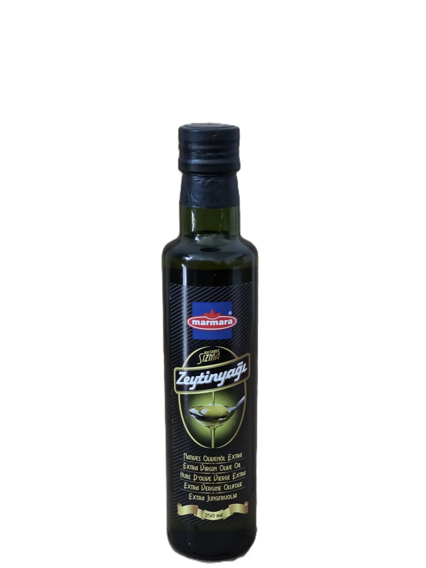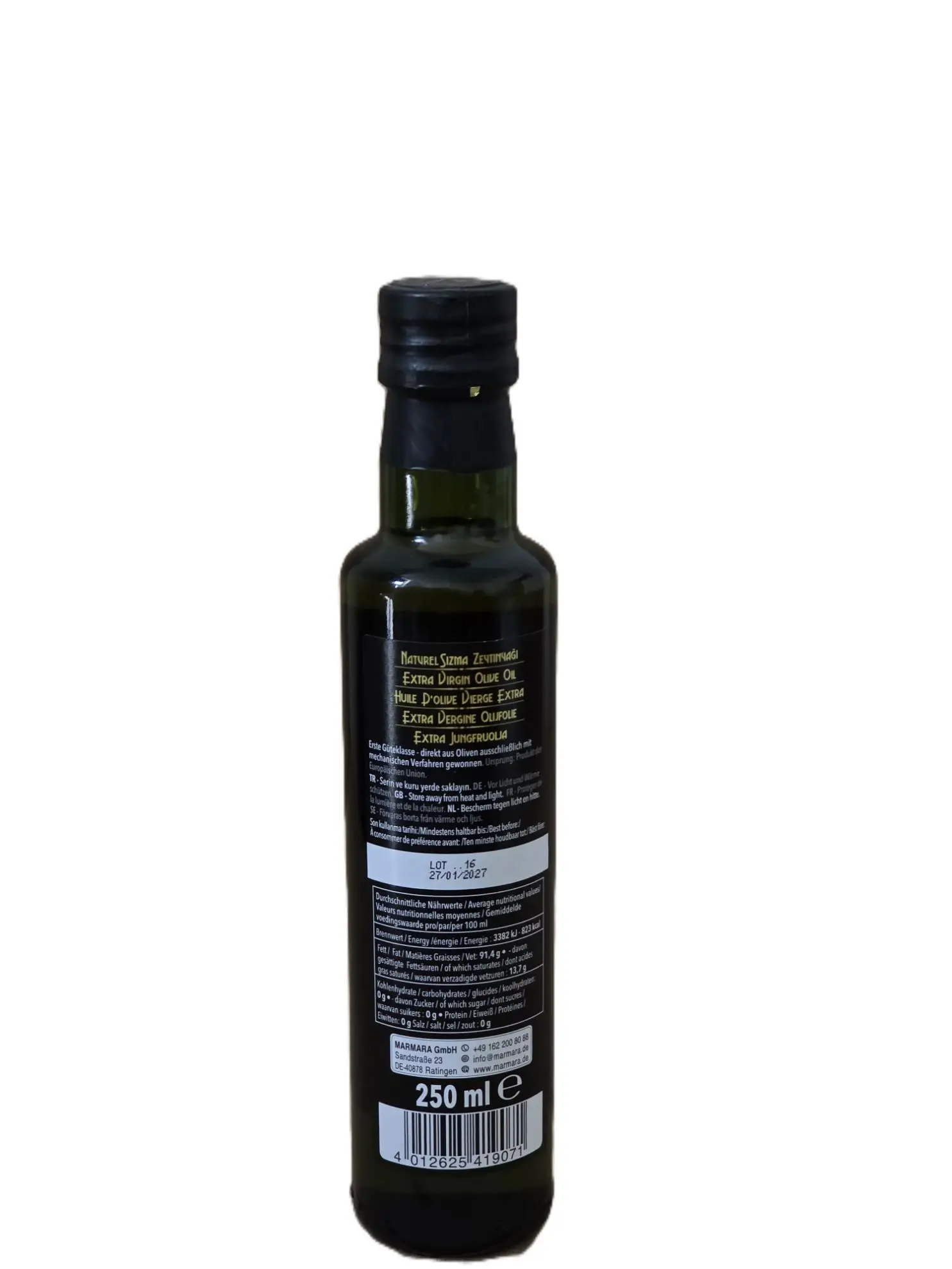 Natives Olivenöl Extra von Marmara, erste Güteklasse – direkt aus Oliven ausschließlich mit mechanischen Verfahren gewonnen. Inhalt: 250 ml.