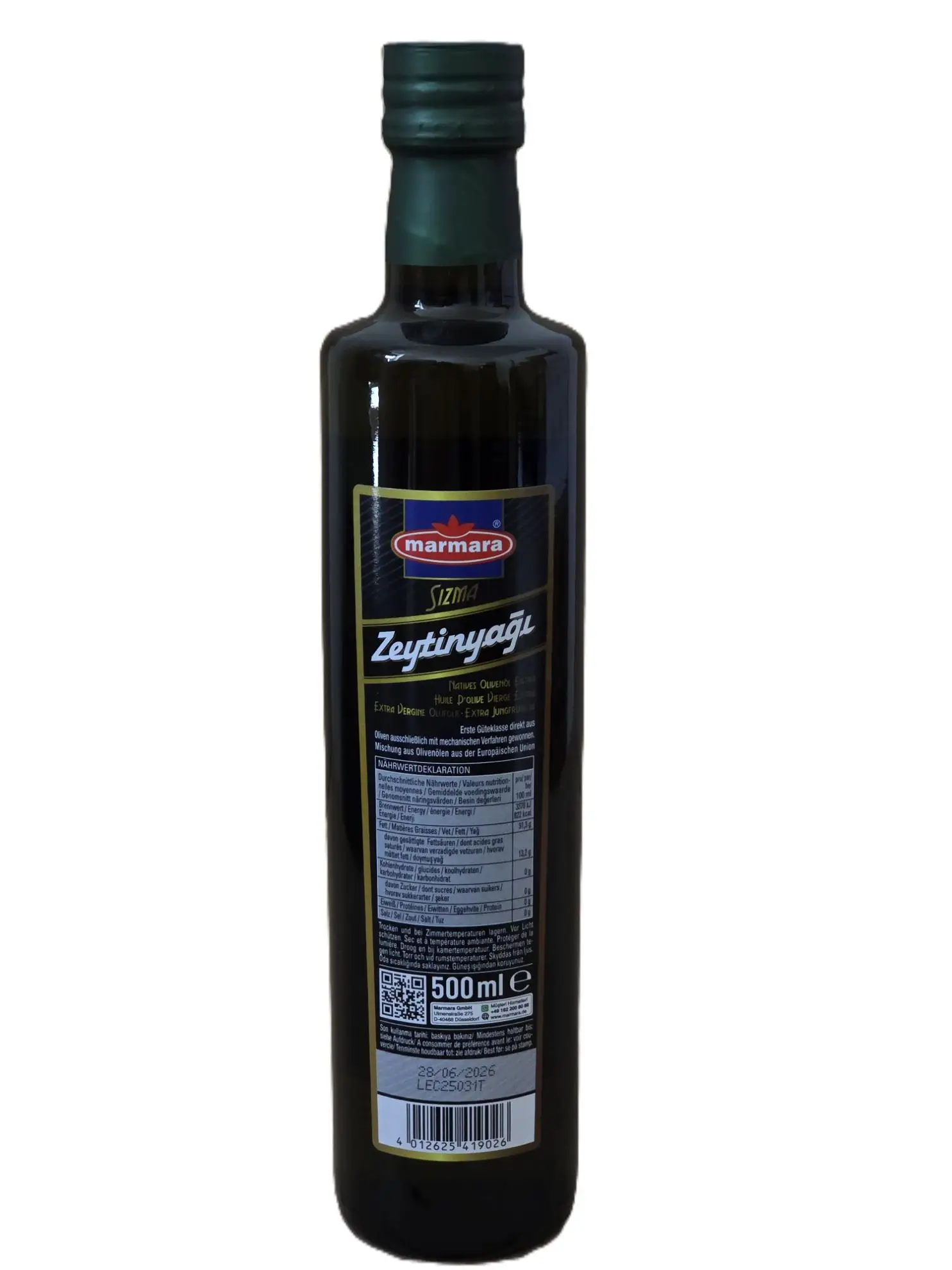 Natives Olivenöl Extra (Sızma Zeytinyağı). Mischung von Olivenölen aus der EU, direkt aus Oliven ausschließlich mit mechanischen Verfahren gewonnen. Inhalt: 500 ml.