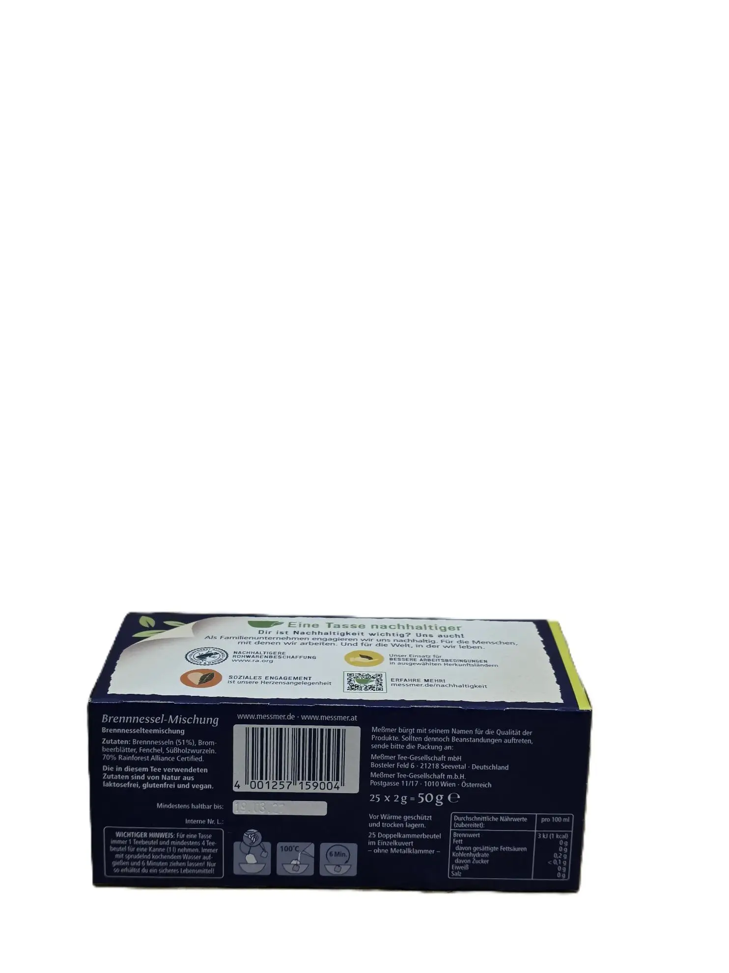 Kräutertee mit Brennnessel‑Mischung; 25 Teebeutel. Würziger, krautiger Geschmack. Nettogewicht 50 g.