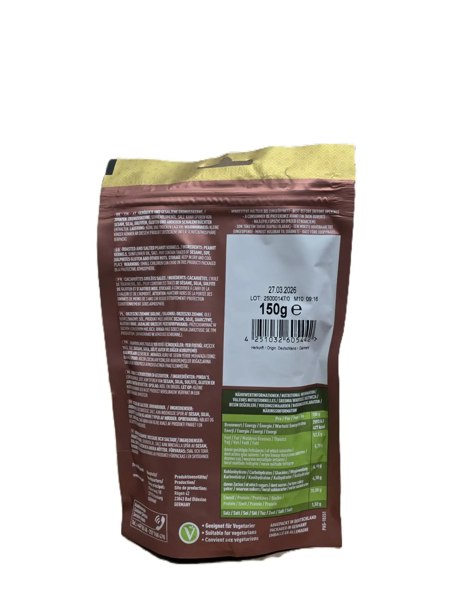 Geröstete und gesalzene Erdnusskerne, 150 Gramm Packung.