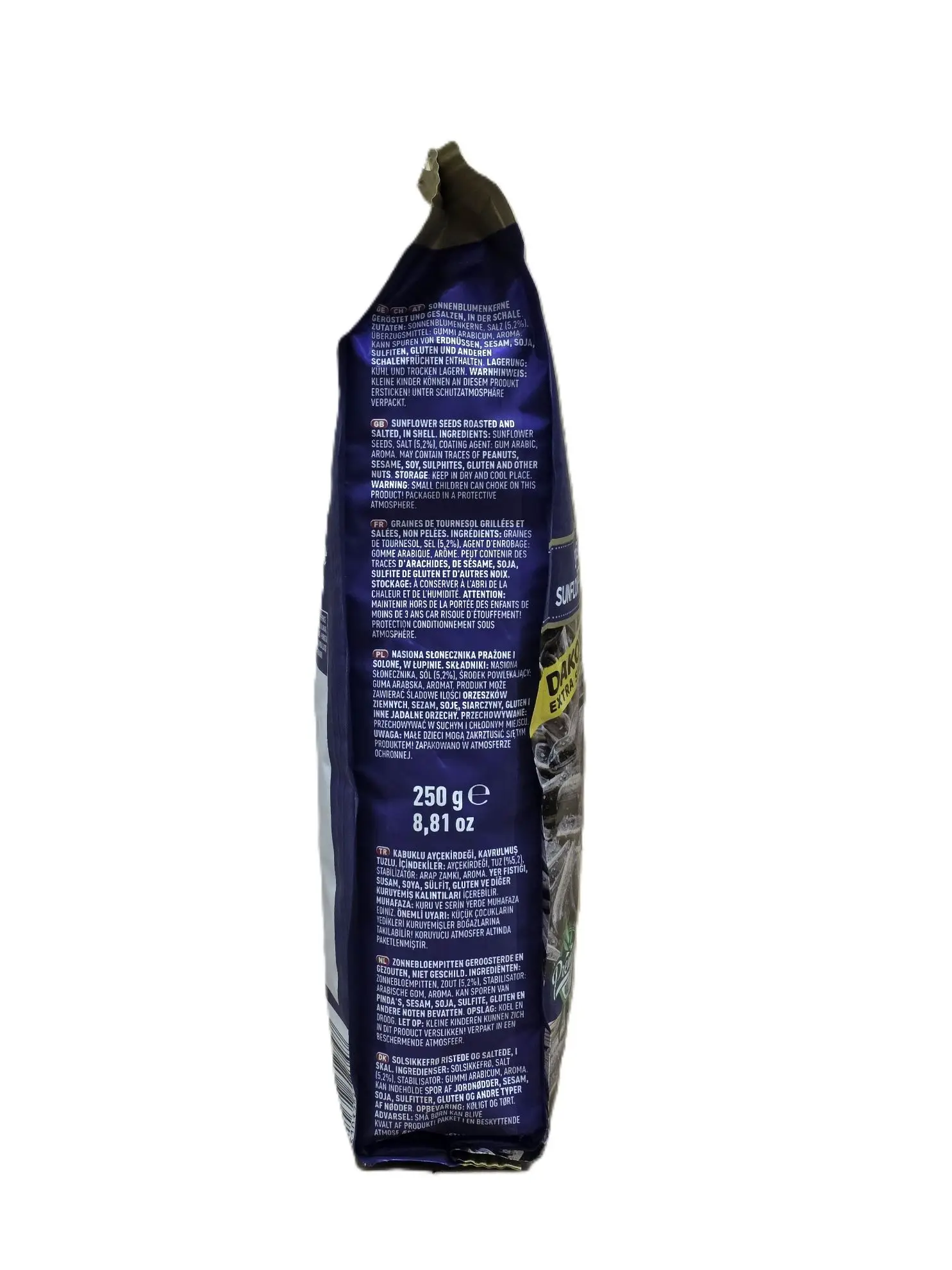 Geröstete und extra gesalzene Sonnenblumenkerne (Dakota), 250 Gramm Packung.