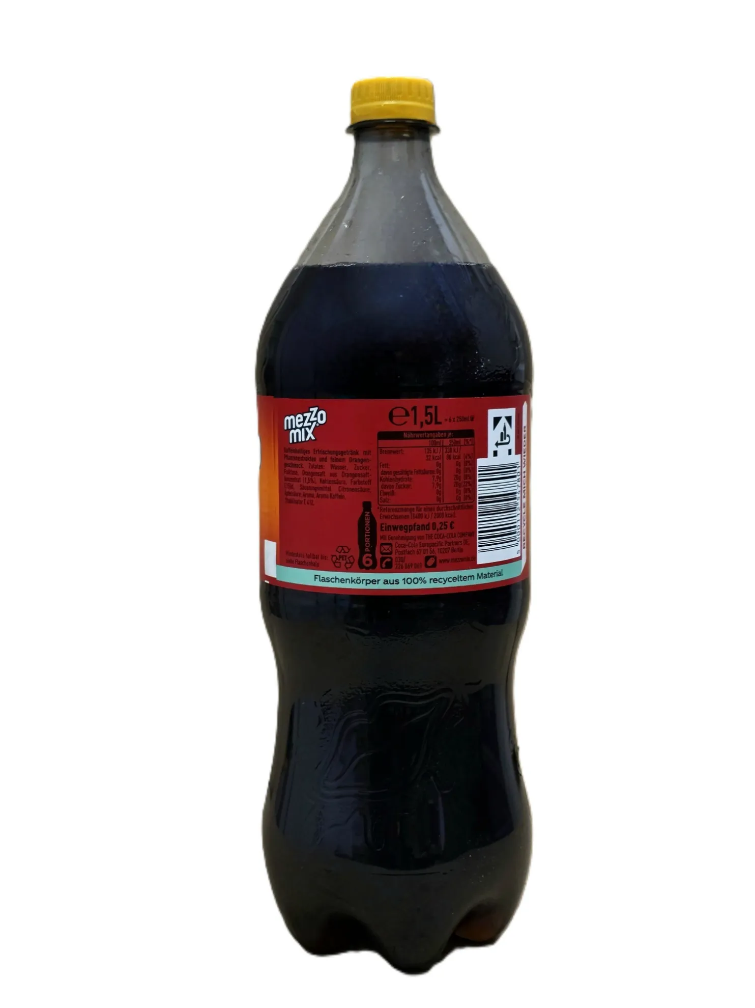 Koffeinhaltiges Erfrischungsgetränk mit Pflanzenextrakten und feinem Orangengeschmack. 1,5L PET-Flasche.