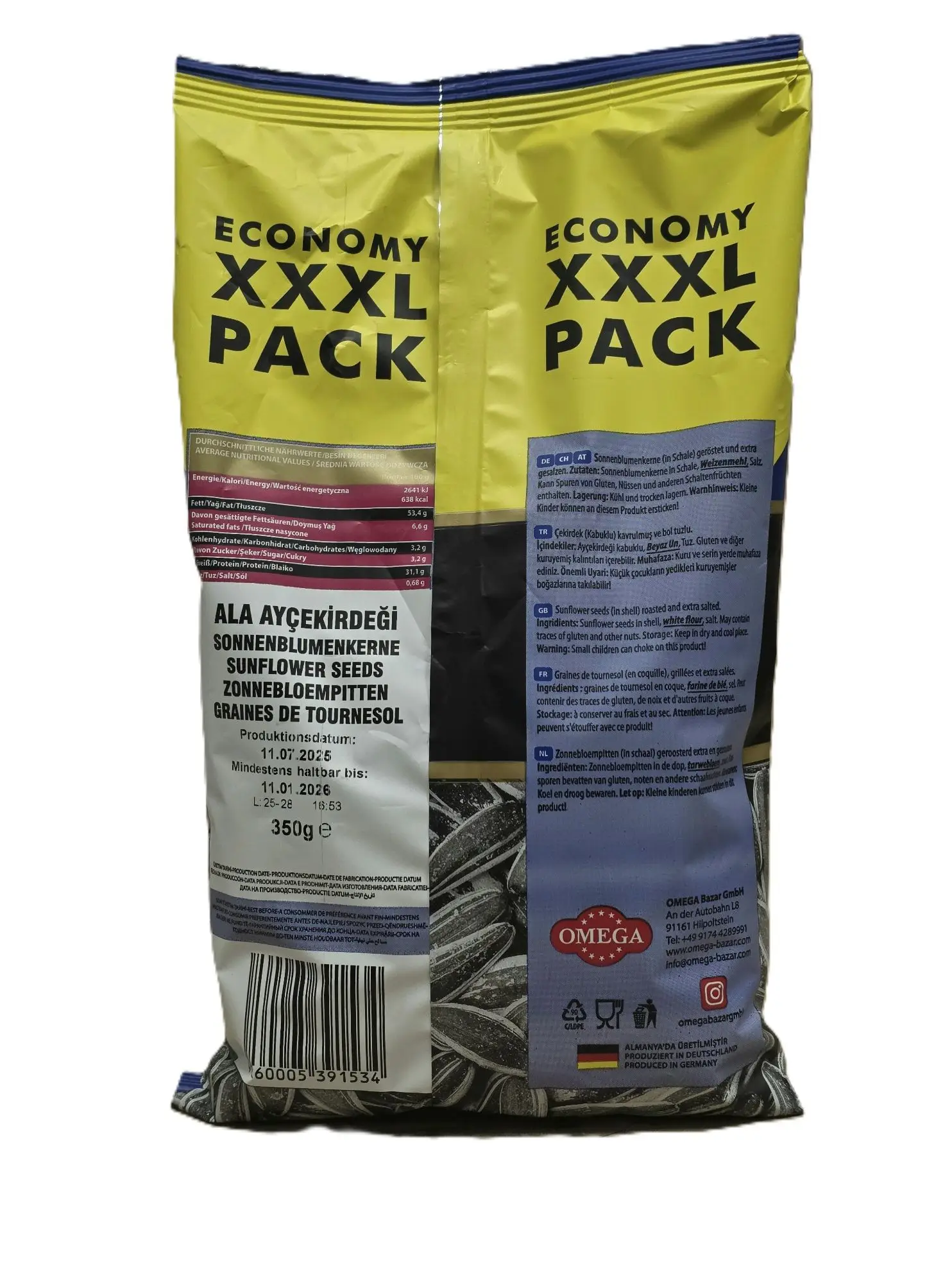 Geröstete ve ekstra gesalzene Sonnenblumenkerne, 350 Gramm Packung.