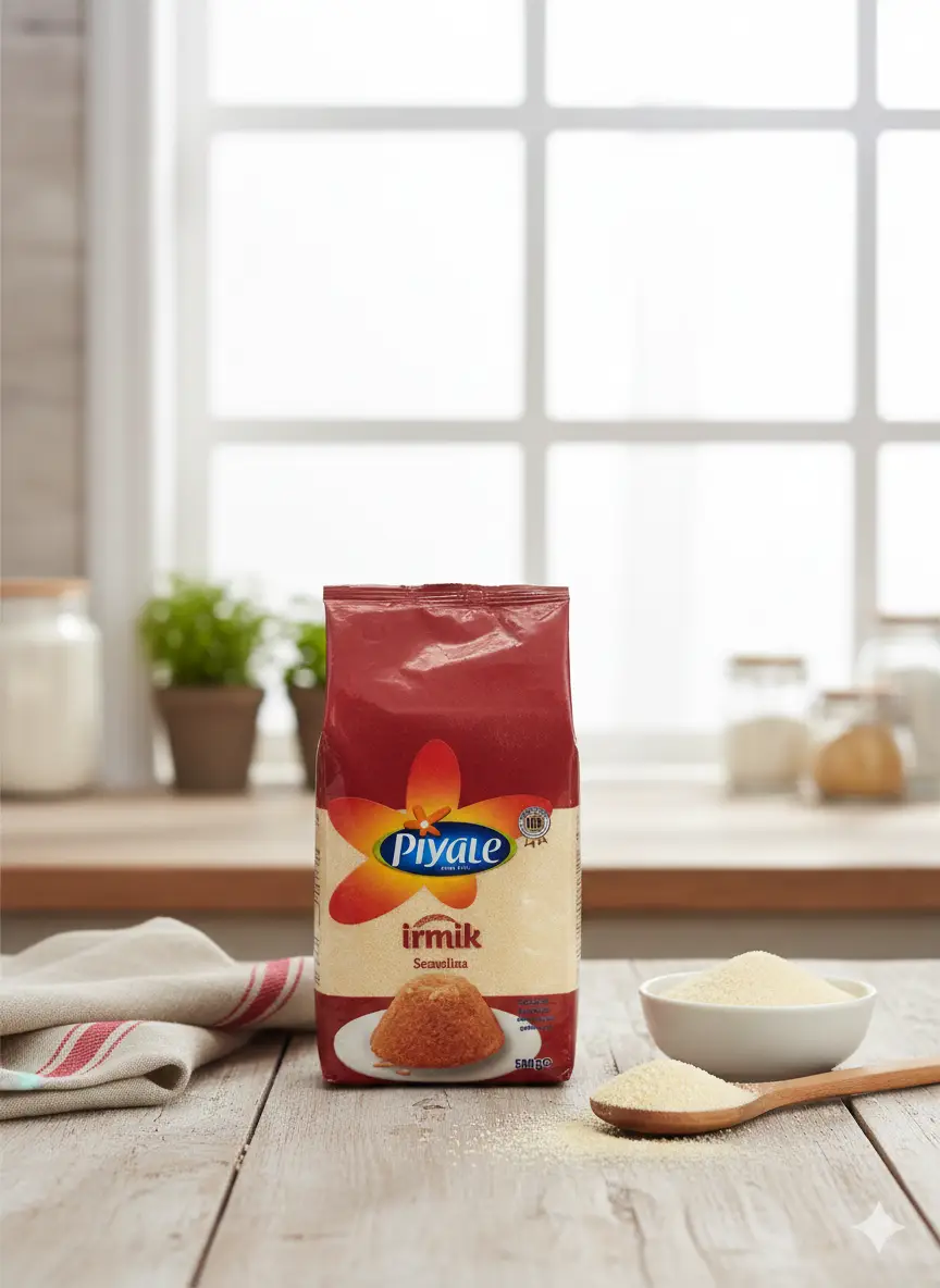 Piyale Grieß (Irmik) – Hochwertiger Hartweizengrieß, ideal für Desserts wie Helva oder Milchgrießbrei. Auch für Pasta und Gebäck geeignet. Nettogewicht: 500g. Kategorie: Mehl & Getreideprodukte.