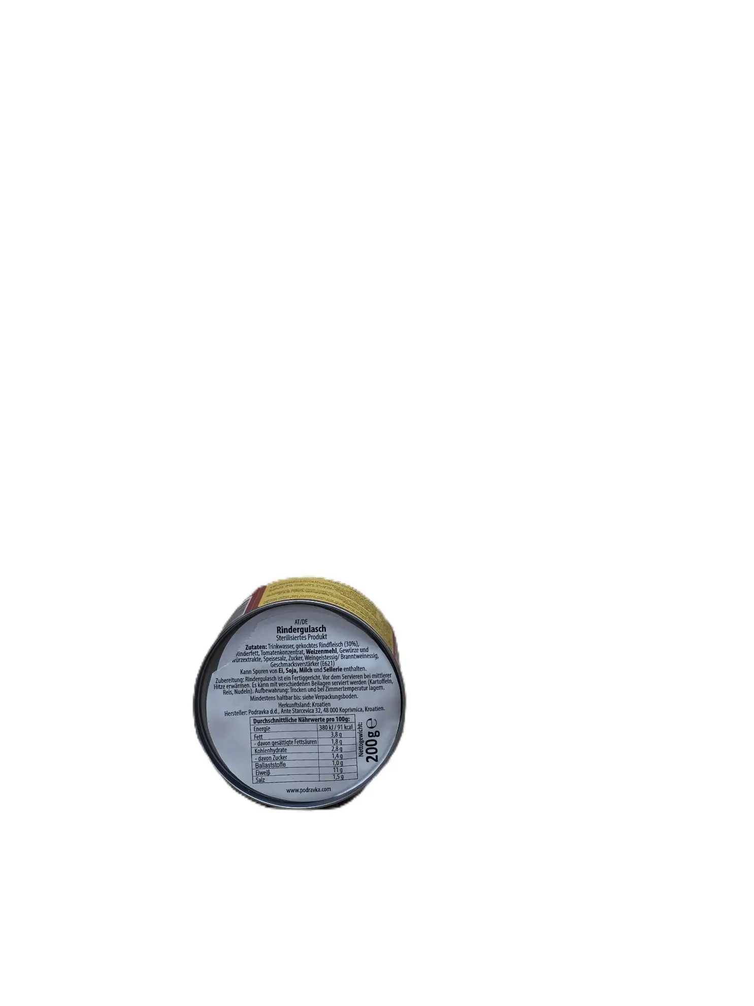 Podravka Beef Goulash 200g – Würziges Rindergulasch in praktischer Konservendose. Einfach zu erwärmen, ideal für eine schnelle und köstliche Mahlzeit. Nettogewicht: 200g.