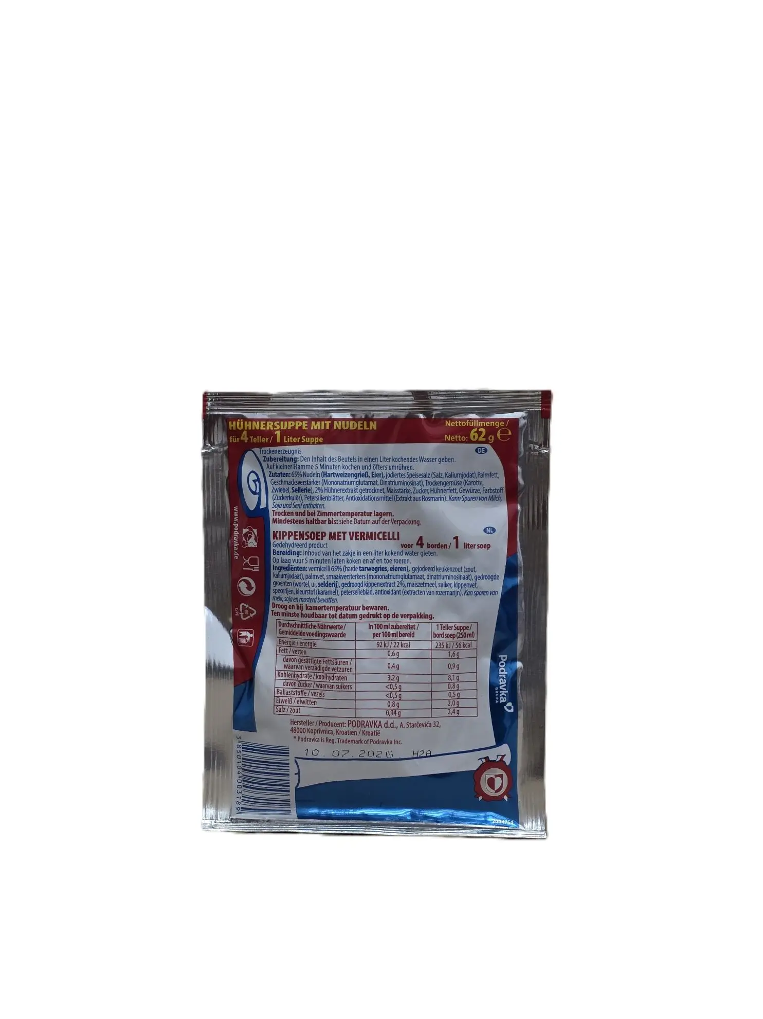 Instant Hühnersuppe mit Nudeln von Podravka, Portionsbeutel. Nettofüllmenge: 62 g. Einfach in kochendem Wasser zubereiten; ideal für eine schnelle Suppe.