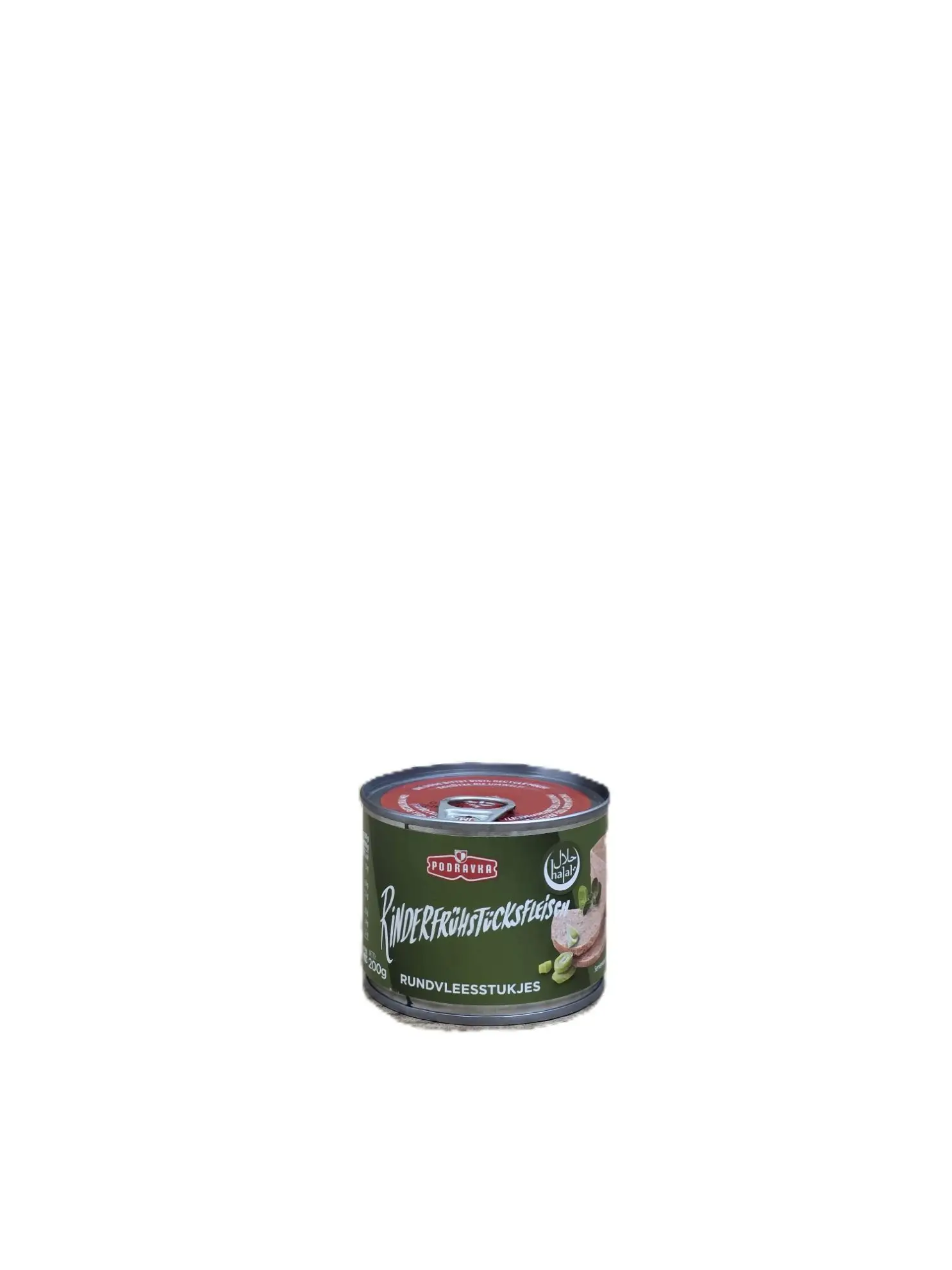 Sterilisiertes Rinderfrühstücksfleisch in der Dose. Nettofüllmenge: 200 g. Verzehrfertig, ideal für Sandwiches, Reisen oder Camping.