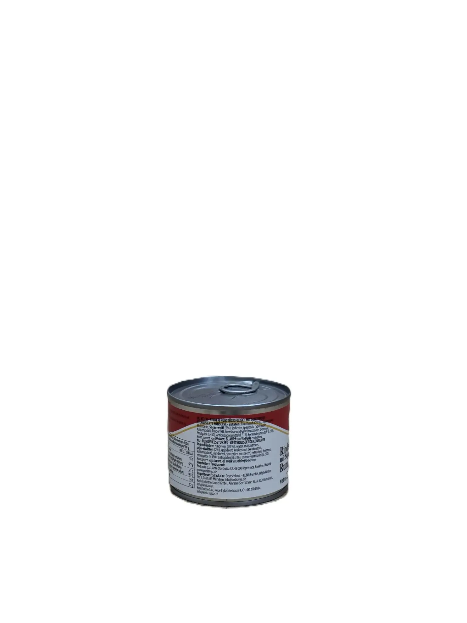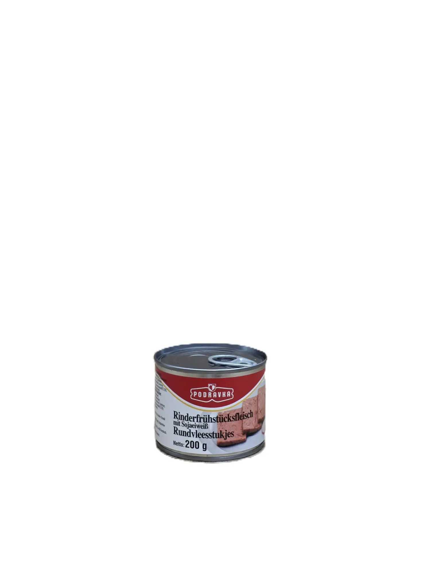 Rinderfrühstücksfleisch mit Sojaeiweiß, sterilisiert und verzehrfertig. Nettofüllmenge: 200 g.