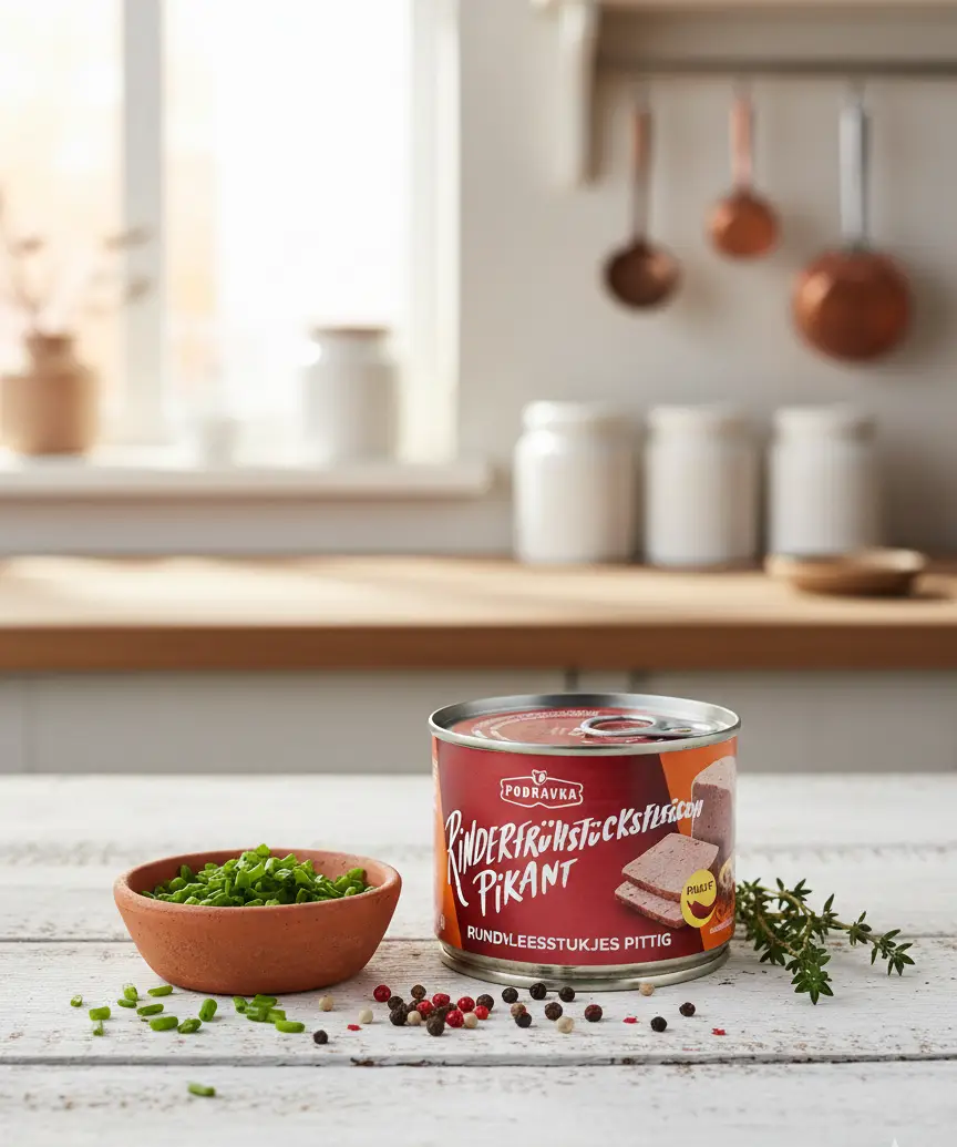 Pikant gewürztes Rinderfrühstücksfleisch in der Dose. Nettofüllmenge: 200 g. Verzehrfertig, ideal für Brotzeit.