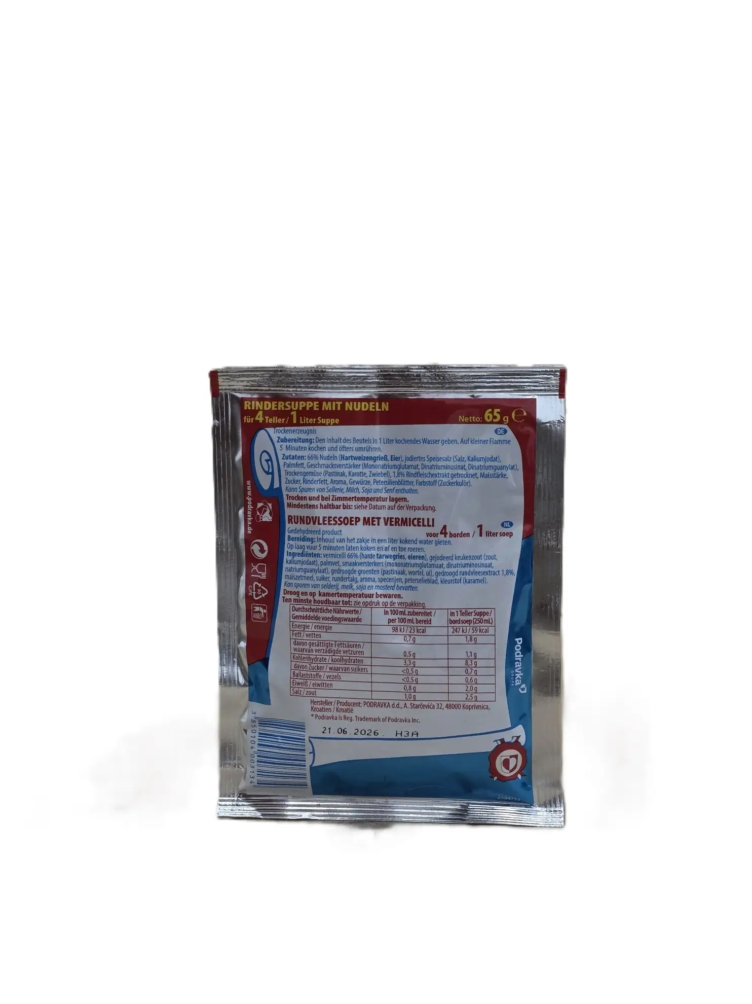 Trockensuppe (Rindersuppe mit Nudeln) – ergibt 1 Liter Suppe bzw. 4 Teller. Zubereitung: Beutelinhalt in kochendes Wasser geben und kurz köcheln lassen. Nettogewicht: 65 g.