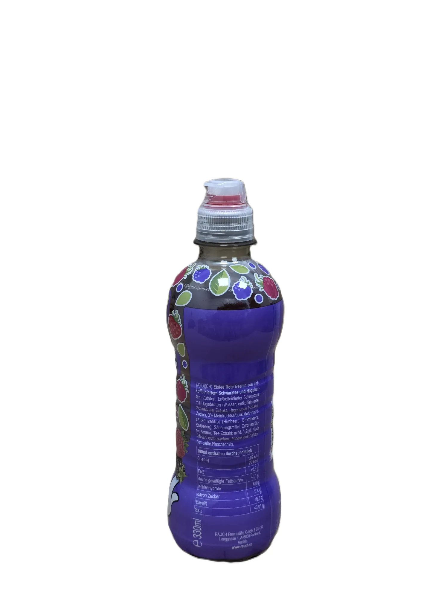 Koffeinfreier Eistee mit dem Geschmack roter Beeren. Enthält 3% Fruchtsaft und Hagebuttenextrakt. 330ml Flasche.