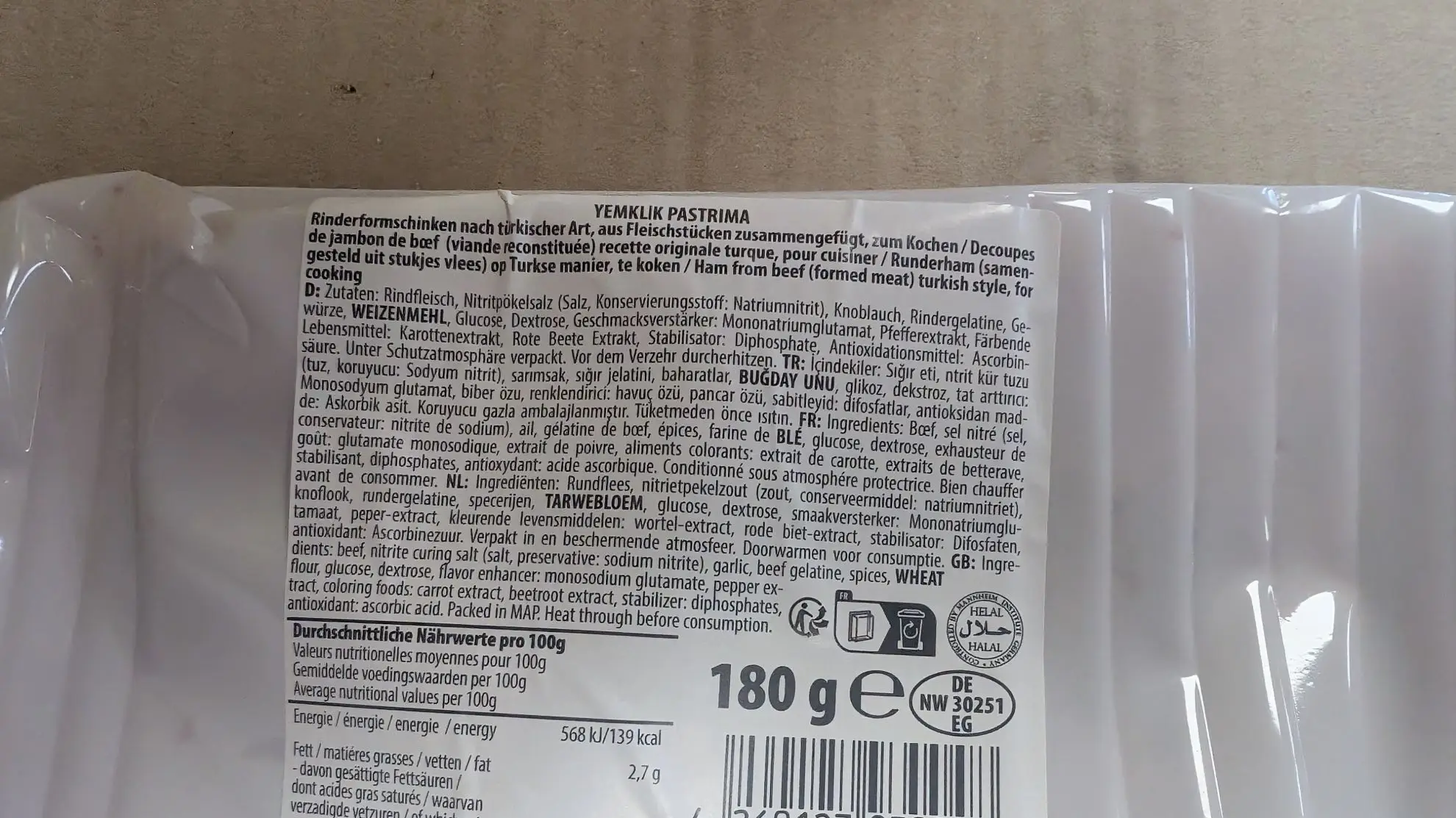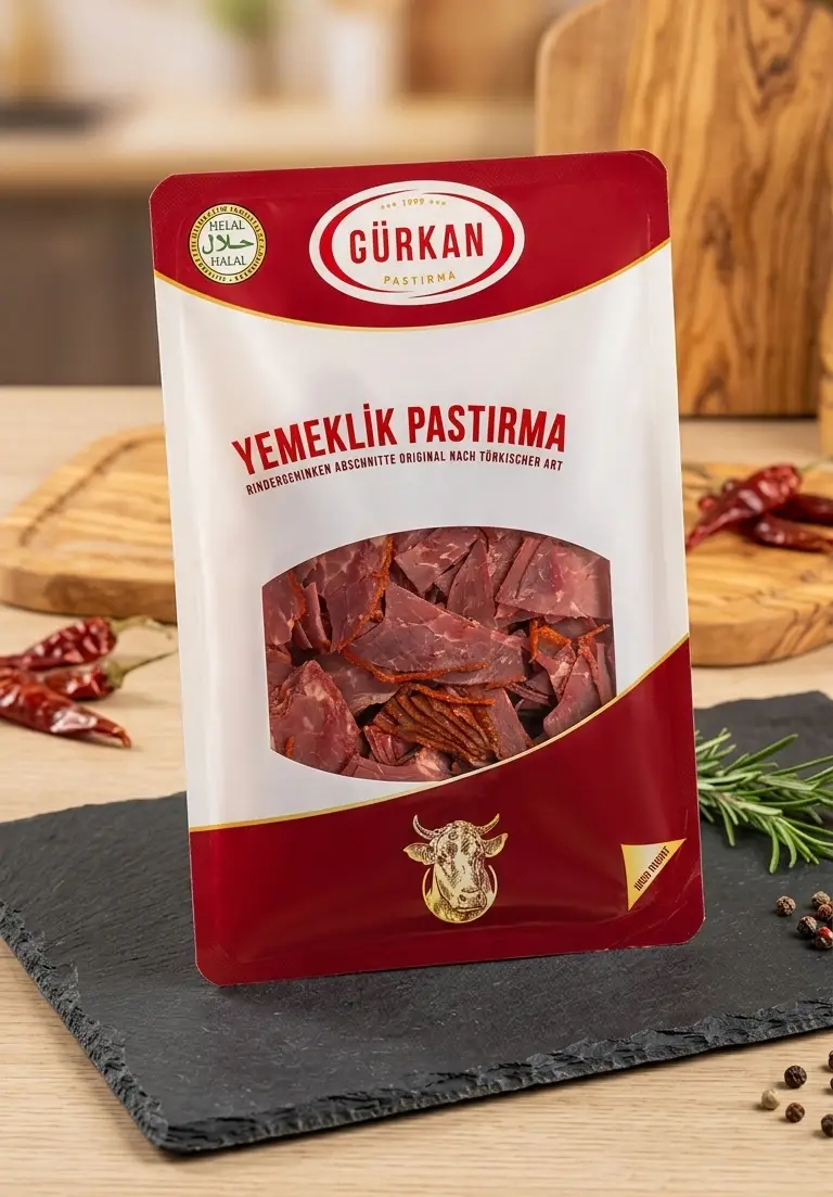 Gürkan Yemeklik Pastırma (180g) – Der würzige Klassiker für Ihre Küche Verleihen Sie Ihren Gerichten den authentischen Geschmack türkischer Tradition. Gürkan Yemeklik Pastırma besteht aus hochwertigem Rindfleisch, das sorgfältig gewürzt, getrocknet und in praktische Stücke geschnitten wurde. Ideal geeignet für: Frühstück: Der Klassiker Pastırmalı Yumurta (Spiegelei mit Pastırma). Warme Gerichte: Als geschmacksintensive Zutat für Eintöpfe, Kuru Fasulye (weiße Bohnen) oder Aufläufe. Qualität: Halal-zertifiziert und einfach zu portionieren.