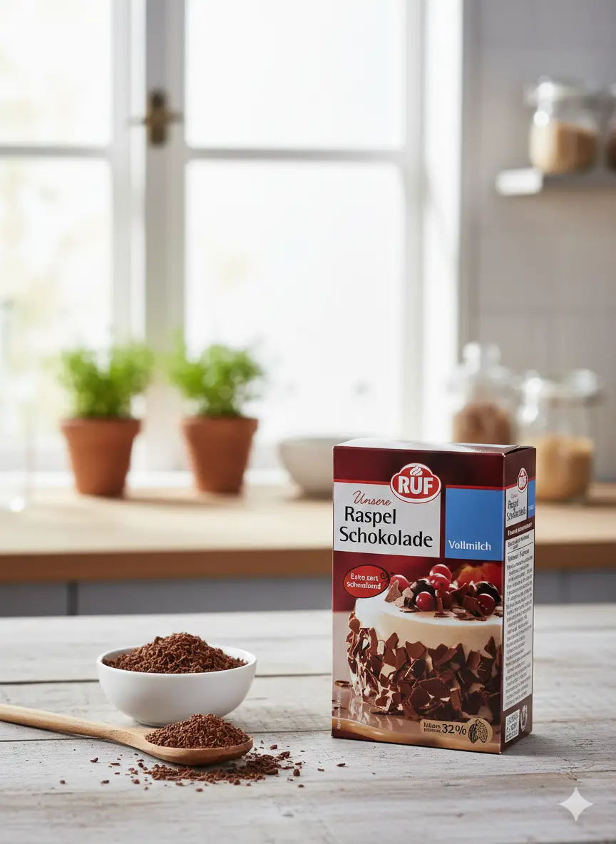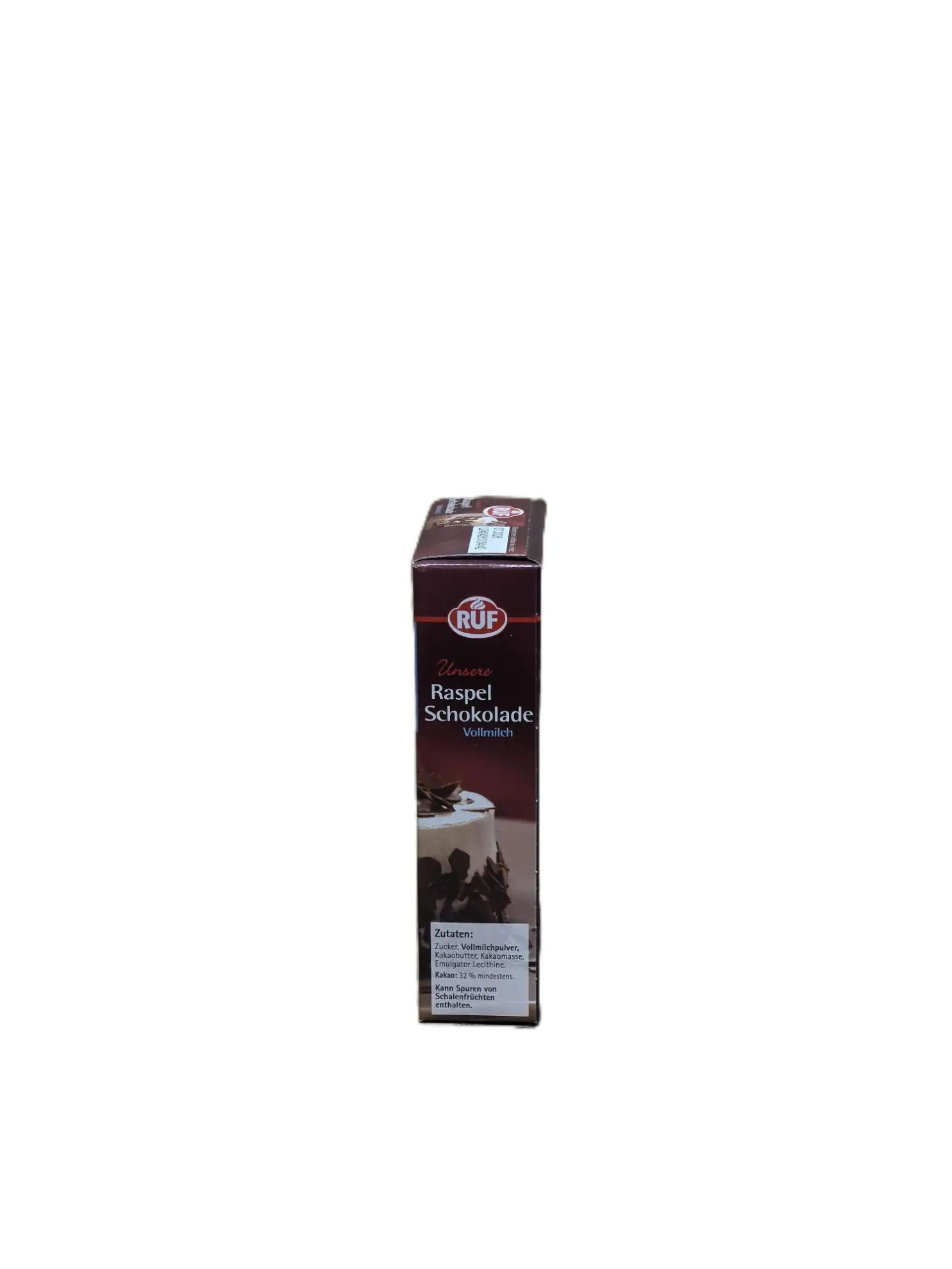 Raspelschokolade Vollmilch (Unsere Raspel Schokolade) extra zart, schmelzend. Mit mind. 32% Kakao. Zum Dekorieren und Backen. Enthält 100 Gramm.