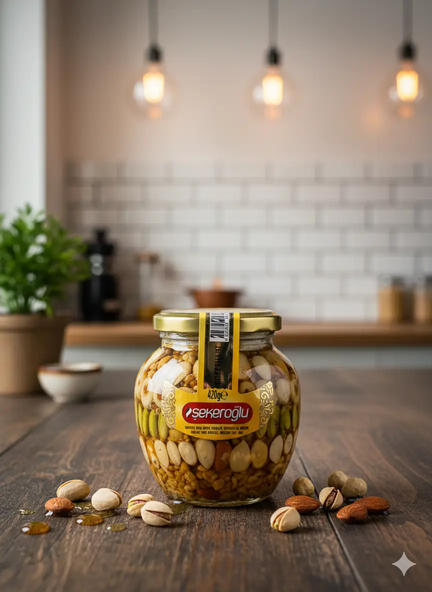 Dessert mit Nüssen in Honigsirup, im Glas. Nettogewicht 420 g.