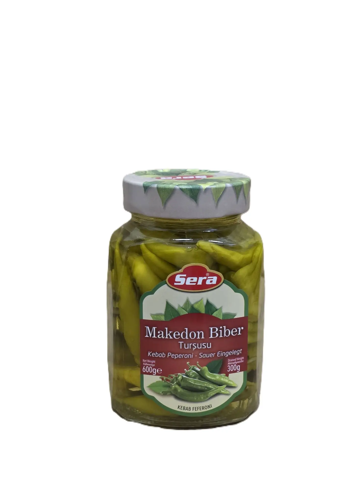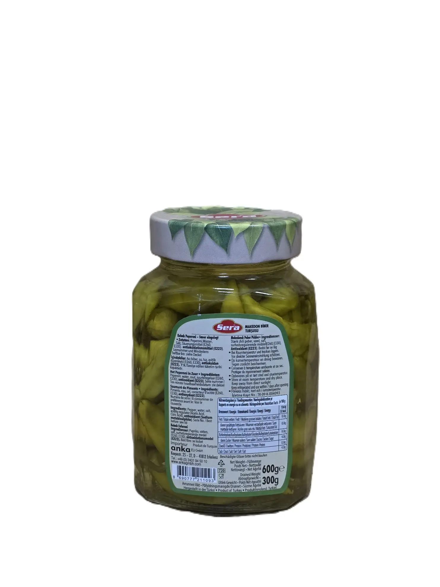 Sera Kebab Peperoni – Leicht scharfe, aromatische Pfefferschoten in Essiglake. Ideal als Beilage zu Fleischgerichten. Nettofüllmenge: 600g, Abtropfgewicht: 300g.