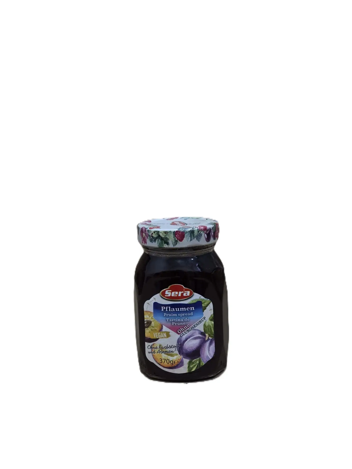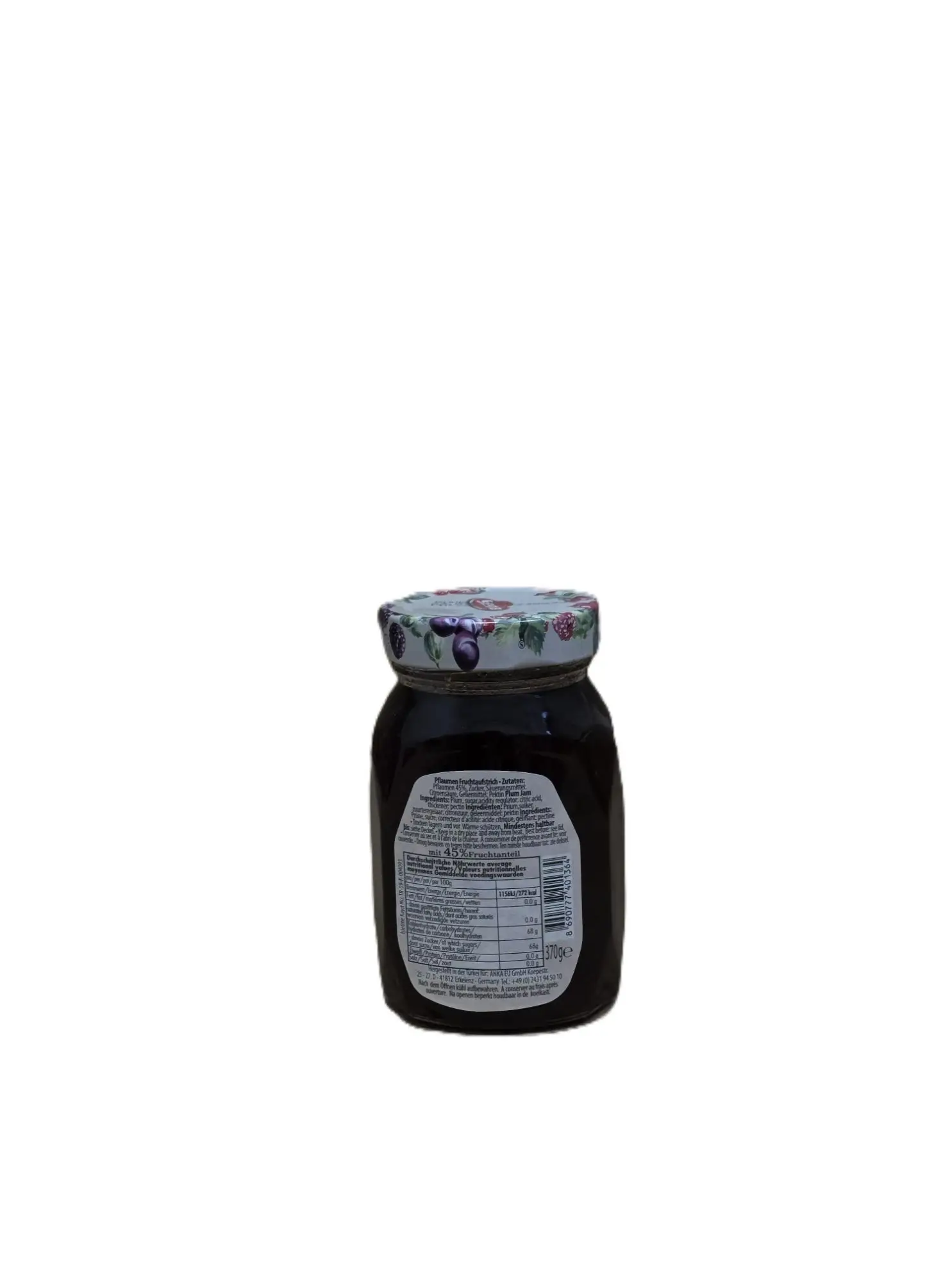 Pflaumen‑Fruchtaufstrich mit 45% Fruchtanteil, vegan, ohne Farbstoffe und Aromen. Ohne Glukosesirup. Inhalt: 370 g.