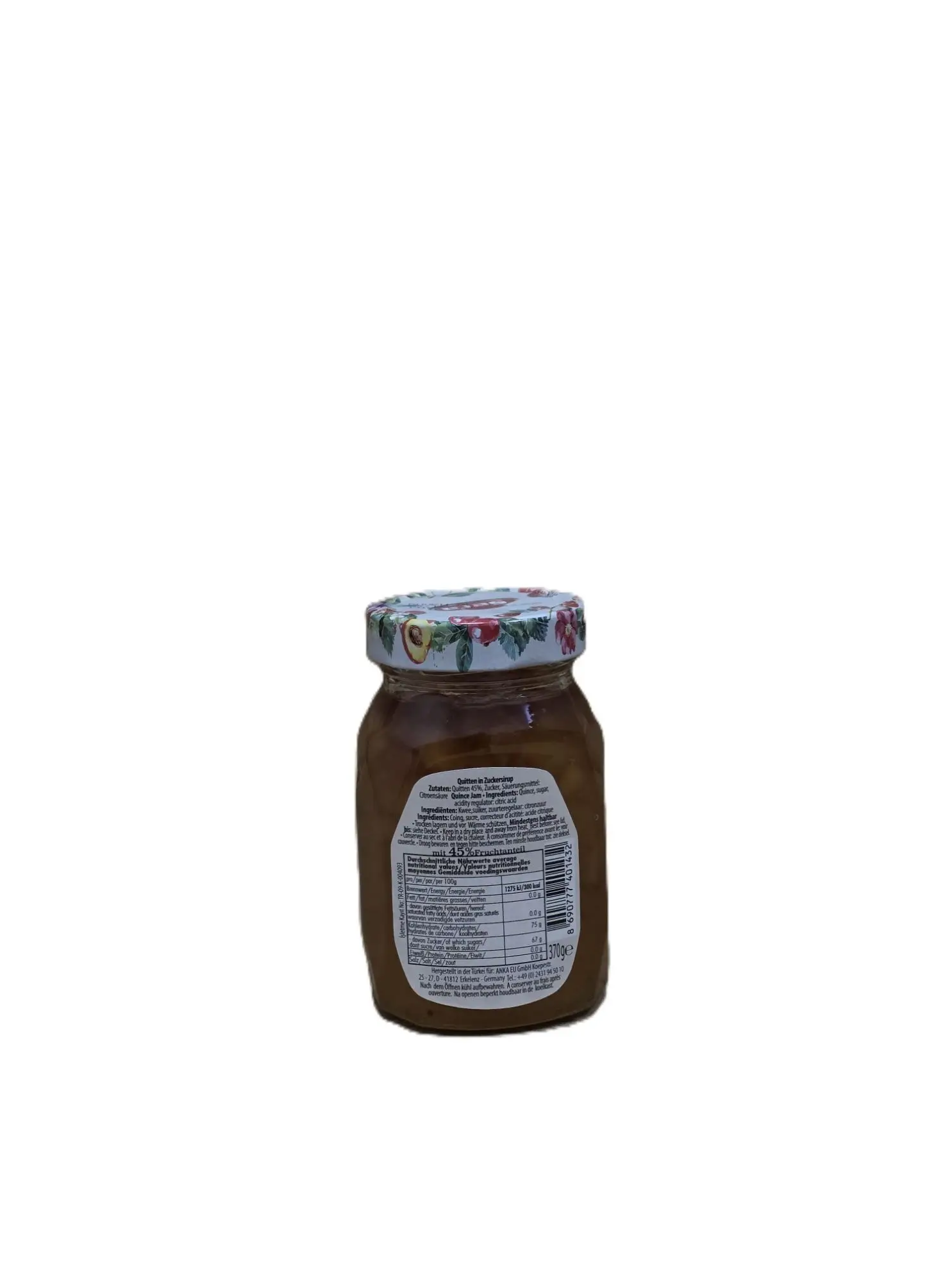 Quitten‑Fruchtaufstrich mit 45% Fruchtanteil, vegan, ohne Farbstoffe und Aromen. Ohne Glukosesirup. Inhalt: 370 g.