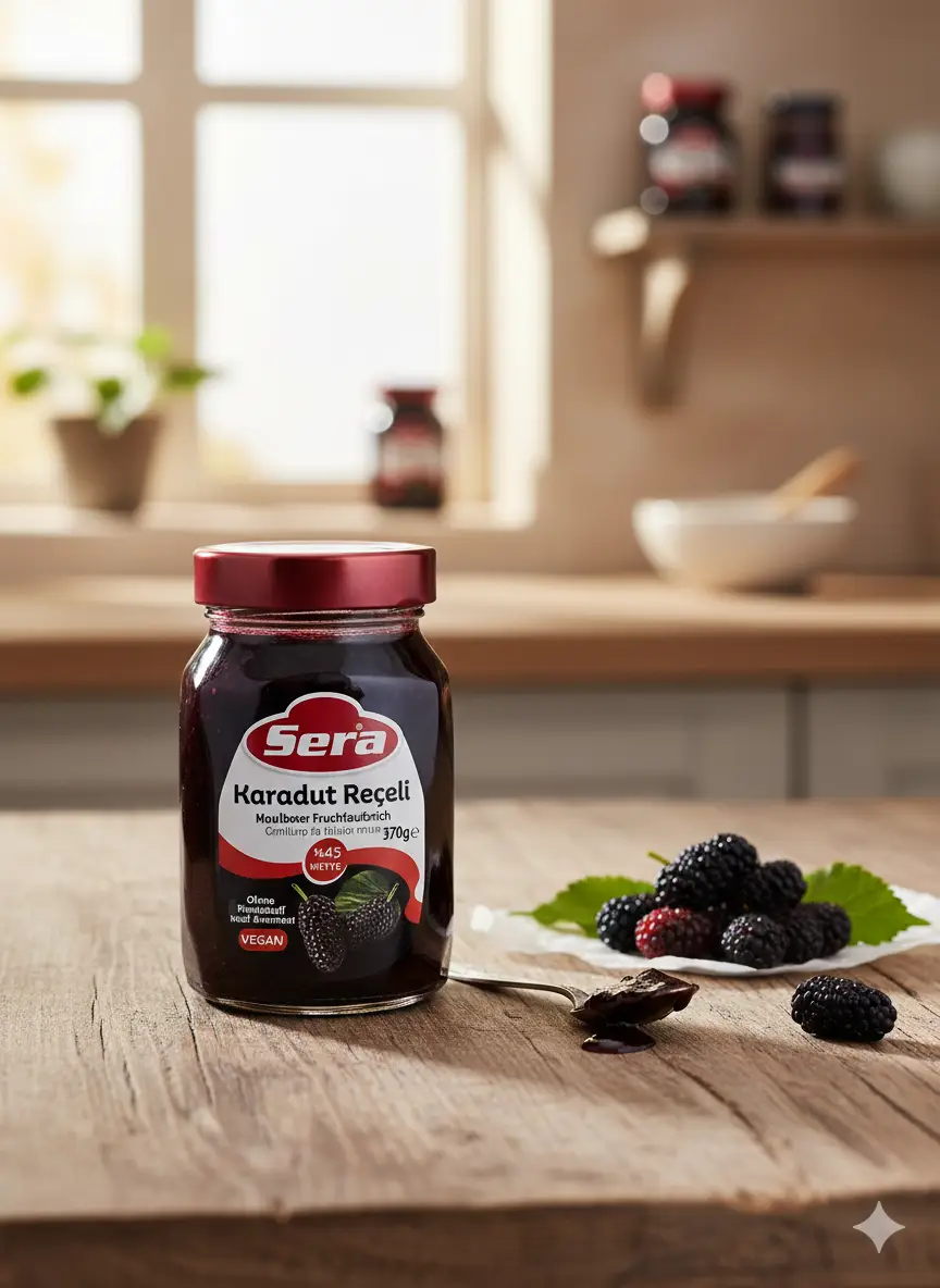 Konfitüre aus schwarzen Maulbeeren (370 g) von Sera; laut Etikett vegan, ohne Farbstoffe/Aromen.
