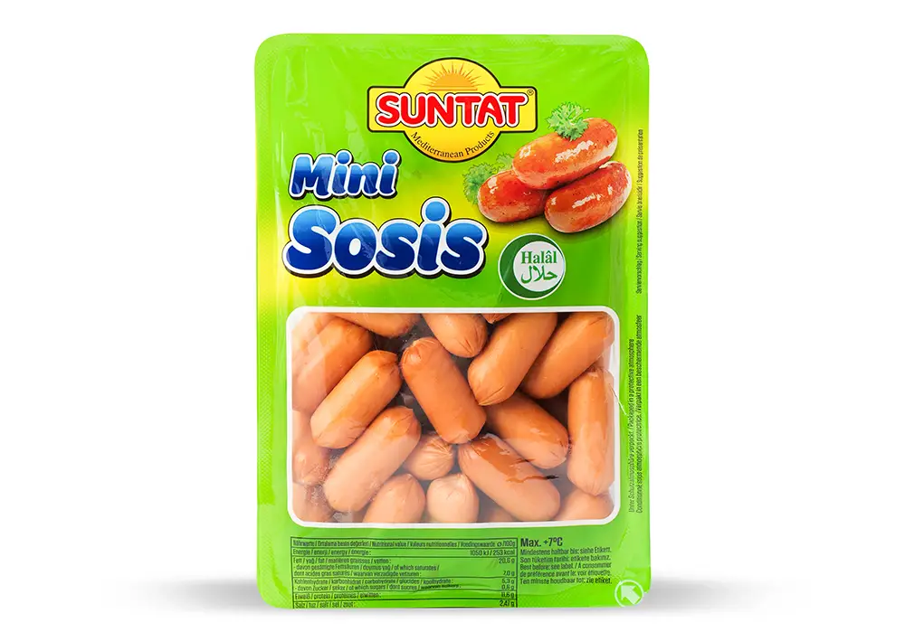 Halal Mini-Würstchen aus 55% Hähnchenfleisch und 20% Putenfleisch, verfeinert mit Hähnchenfett, Wasser, Kartoffelstärke, Salz, Glukosesirup, Dextrose und Gewürzen. Perfekt für Sandwiches und Frühstück. Gewicht: 400g.