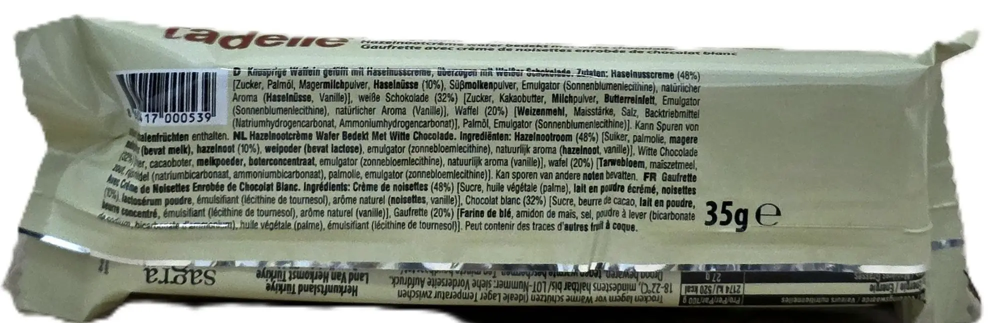 Riegel mit Haselnusscremefüllung und Überzug aus weißer Schokolade, 35g Riegel.