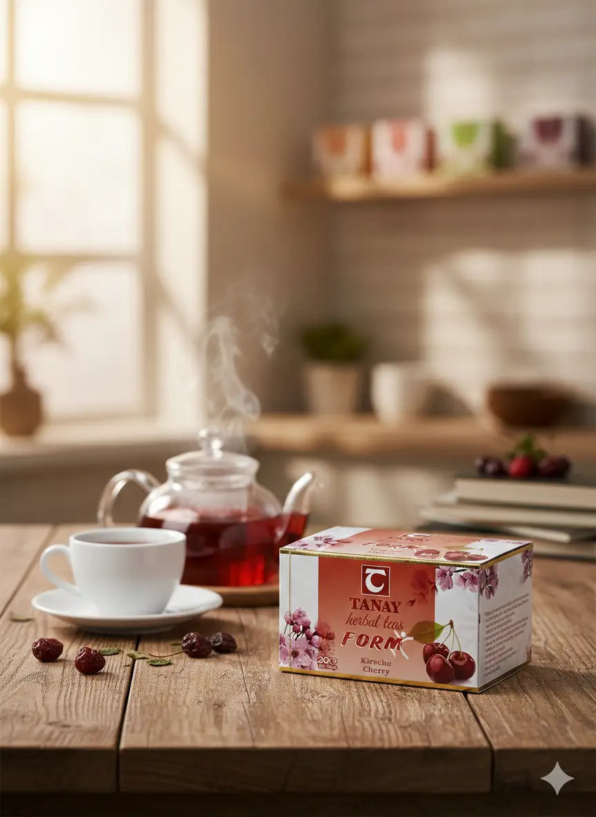 Tanay Form Kirschtee ist ein fruchtiger Kräutertee mit Kirscharoma. Ideal für eine leichte und aromatische Teepause. Enthält 20 Teebeutel. Inhalt: 30g.